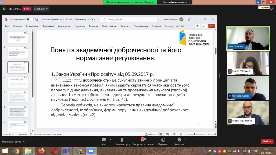 4 жовтня 2022 року здобувачі вищої освіти ОПП Культурологія, ОПП Менеджмент соціокультурної діяльності, ОПП Філософія (Крістіна Данильчук, Євгенія Шабатура, Головіна Соф'я, Ірина Квасенко, Яна Кочмар, Ніколь Гавриш, Яна Грицак, Надія Ладан, Дарія Бабичева, Руслан Паїл, Олег Фінкін), аспіранти ОНП Філософія (Іванна Ніколаєва, Людмила Городнюк, Олена Парадюк, Віолета Світлицька) та науково-педагогічні працівники кафедри філософії, соціології та менеджменту соціокультурної діяльності (завідувач кафедри, професор Євген Борінштейн, професор Оксана Петінова, доцент Галина Врайт, доцент Зоя Атаманюк, професор Олена Лісеєнко, доцент Андрій Начев, викладач Лариса Самчук) стали слухачами Форуму академічної доброчесності, організованого Національним агентством із забезпечення якості вищої освіти. Спікерами виступили: Назаров Іван Володимирович – заступник Голови Національного агентства із забезпечення якості вищої освіти; Артюхов Артем Євгенович – член Національного агентства із забезпечення якості вищої освіти; Сідляренко Андрій Ігорович – експерт з академічної доброчесності, комерційний директор Unicheck Україна. Під час форуму розглянуто важливі для сучасної української науки питання, а саме – підвищення академічної доброчесності, ролі та завдань Національного агентства із забезпечення якості вищої освіти у просторі академічної доброчесності.