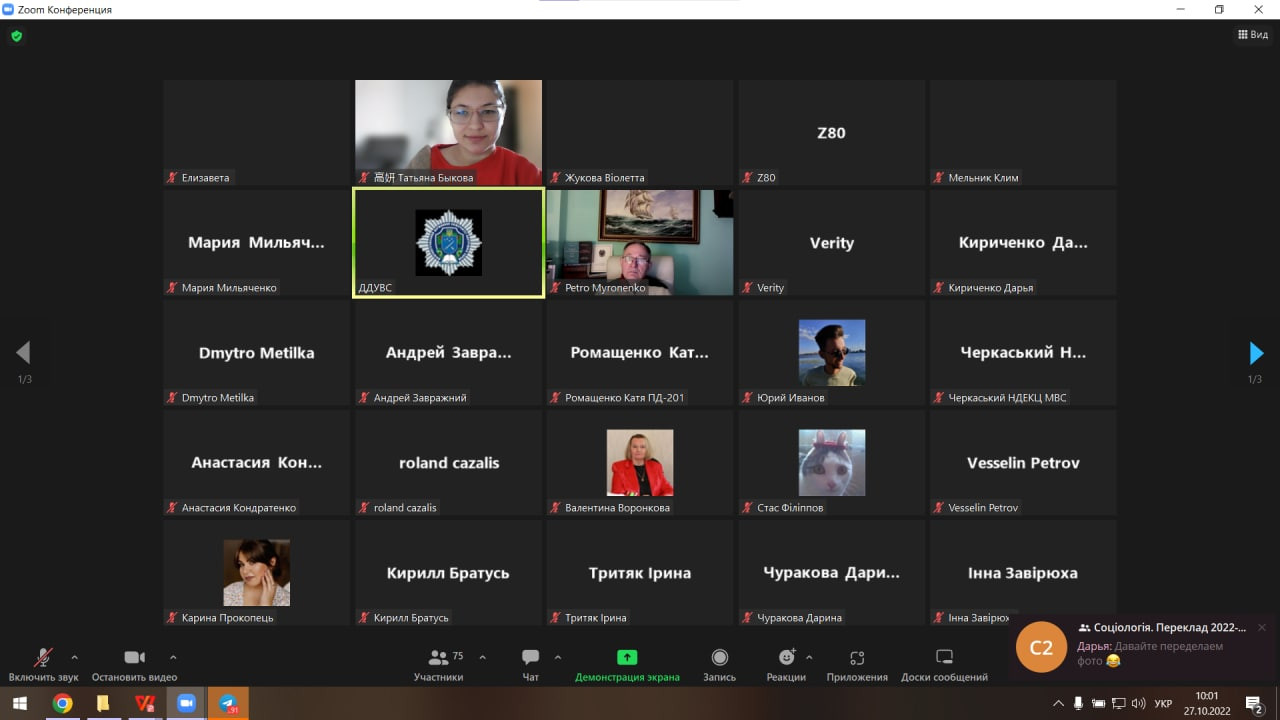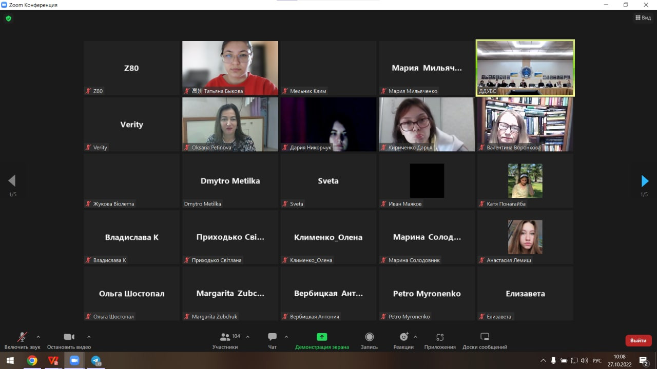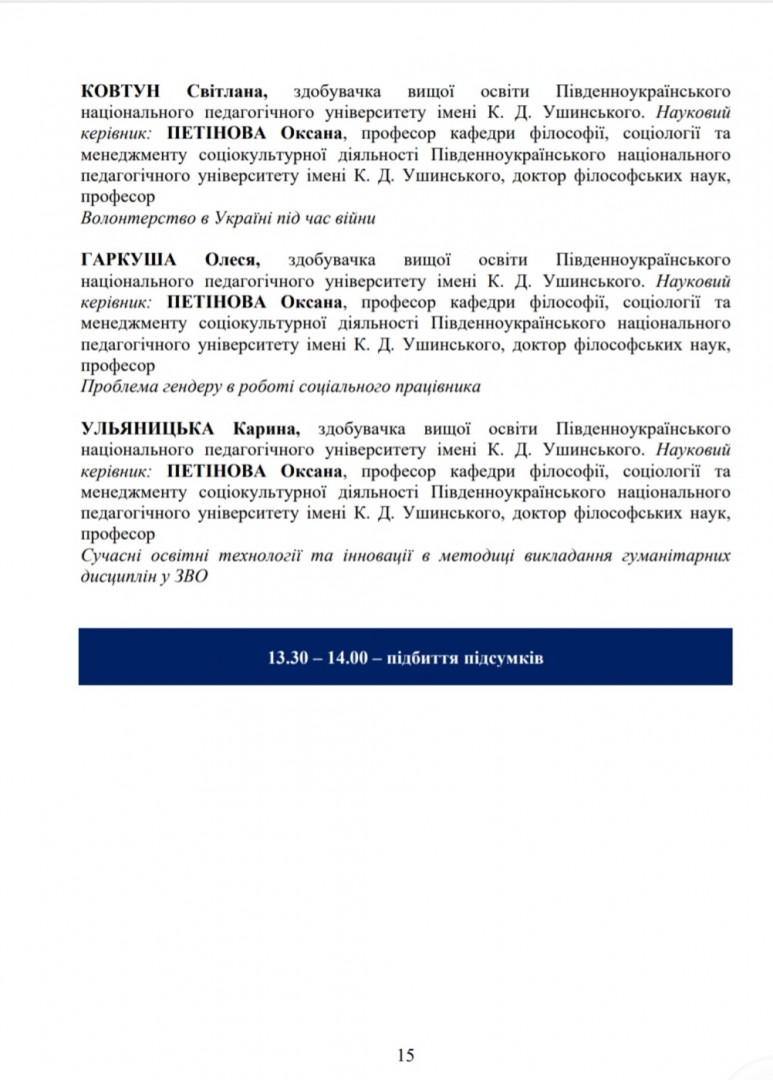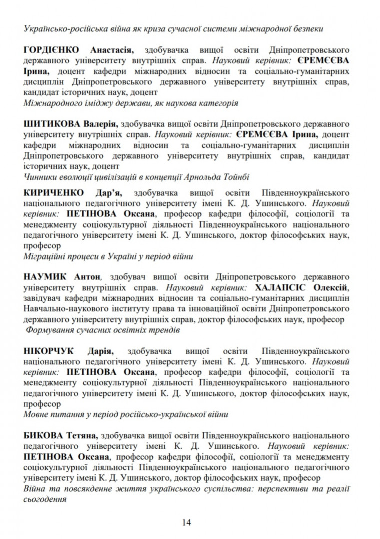 27 жовтня 2022 року науково-педагогічні працівники кафедри філософії, соціології та менеджменту соціокультурної діяльності взяли участь у Міжнародній науково-практичній конференції «Соціально-гуманітарні виміри правової держави», що була організована ЗВО-партнером, – кафедрою міжнародних відносин та соціально-гуманітарних дисциплін Інституту права та інноваційної освіти Дніпропетровського державного університету внутрішніх справ (проф. Оксана Петінова «Добробут, рівень та якість життя як основоположні соціальні індикатори: сутніть та відмінності», проф. Олена Лісеєнко «Соціальна згуртованість українського суспільства в умовах війни: соціологічні показники»).До участі у конференції також залучились члени студентського наукового гуртка «Південноукраїнські наукові студії» (керівник проф. Оксана Петінова) з доповідями: КИРИЧЕНКО Дар’я («Міграційні процеси в Україні у період війни»), НІКОРЧУК Дарія («Мовне питання у період російсько-української війни»), БИКОВА Тетяна («Війна та повсякденне життя українського суспільства: перспективи та реалії сьогодення», ГАРКУША Олеся («Проблема гендеру в роботі соціального працівника»), УЛЬЯНИЦЬКА Карина «Сучасні освітні технології та інновації в методиці викладання гуманітарних дисциплін у ЗВО»).