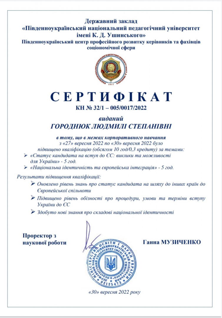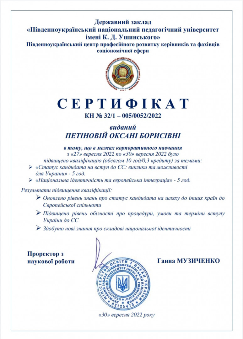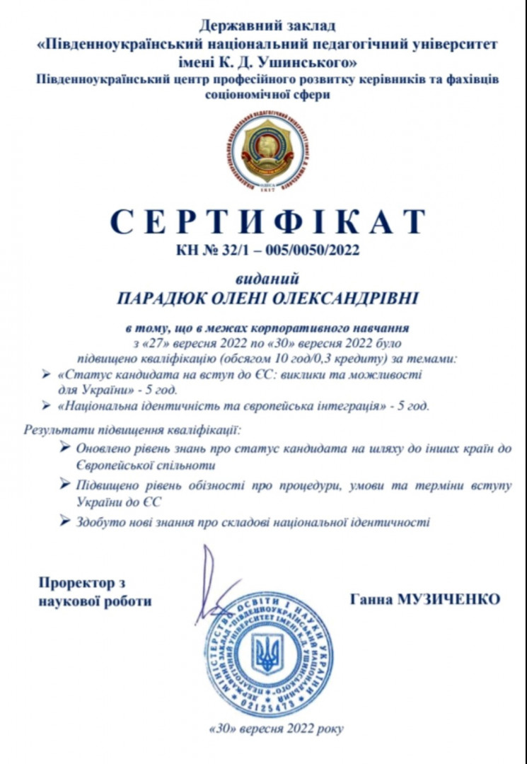 Науково-педагогічні працівники кафедри філософії, соціології та менеджменту соціокультурної діяльності, здобувачі третього (освітньо-наукового), ОНП «Філософія», та першого (бакалаврського) рівнів вищої освіти пройшли в межах корпоративного навчання підвищення кваліфікації за темами: «Статус кандидата на вступ до ЄС: виклики та можливості для України» (5 год.) та «Національна ідентичність та європейська інтеграція (5 год.)». Результати підвищення кваліфікації: оновлено рівень знань про статус кандидата на шляху до інших країн до Європейської спільноти; підвищено рівень обізнаності про процедури, умови та терміни вступу України до ЄС, здобуто нові знання про складові національної ідентичності. Вітаємо учасників з отриманням сертифікатів!