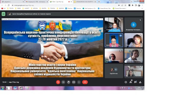 27 – 28 жовтня 2022 року науково-педагогічні працівники кафедри філософії, соціології та менеджменту соціокультурної діяльності (проф. Євген Борінштейн, доц. Зоя Атаманюк, доц. Галина Врайт, викл. Лариса Самчук) взяли участь у Всеукраїнській науково-практичній конференції «Інновації в освіті: сутність, проблеми, перспективи», що була організована кафедрою філософії, політології, психології та права Одеської державної академії будівництва та архітектури. На пленарному засіданні виступила проф. Оксана Петінова з темою «Апокаліпсис ХХІ століття та перспективи розвитку філософії освіти».