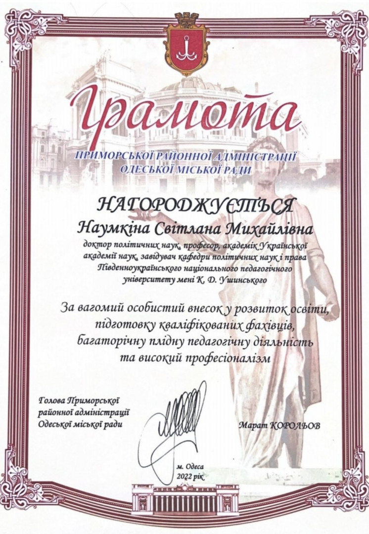 За багаторічну плідну педагогічну діяльність, вагомий особистий внесок у розвиток освітньої галузі, відданість справі впровадження сучасних методів навчання і виховання молодого покоління, високий професіоналізм нагороджено грамотами доктора політичних наук, професора, завідувачку кафедри політичних наук і права Наумкіну С. М.
