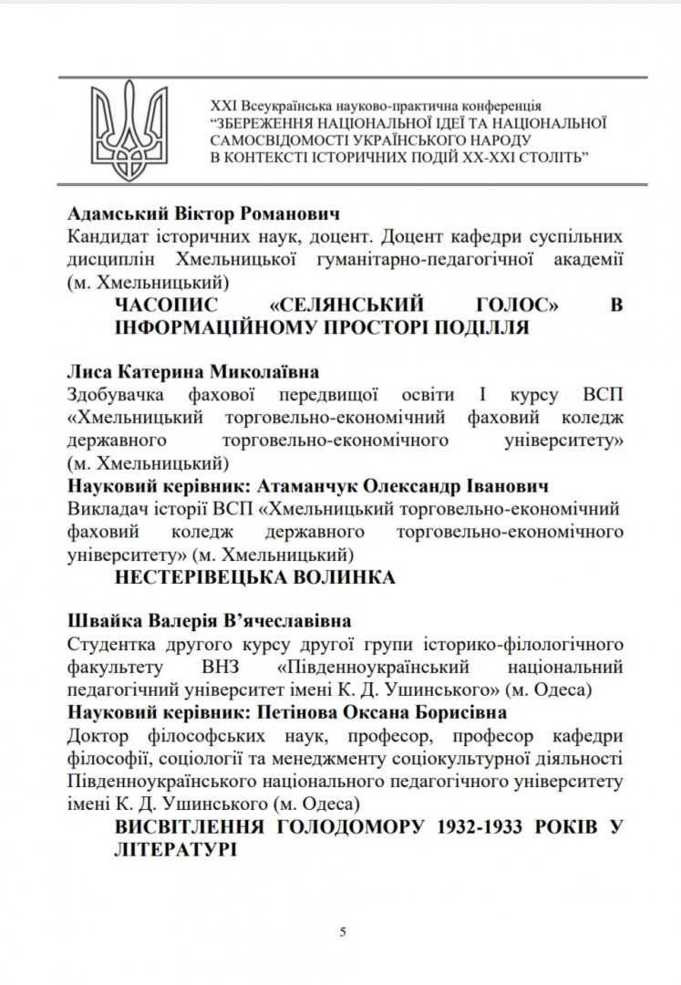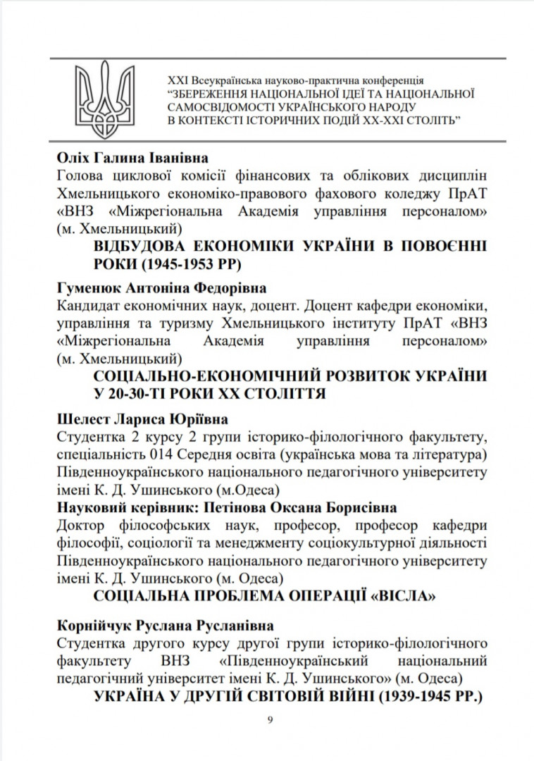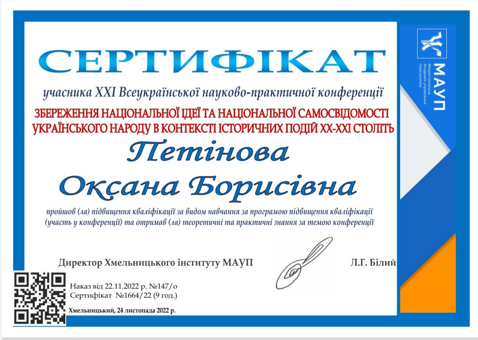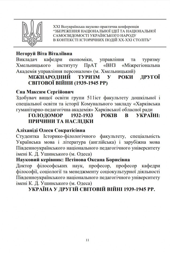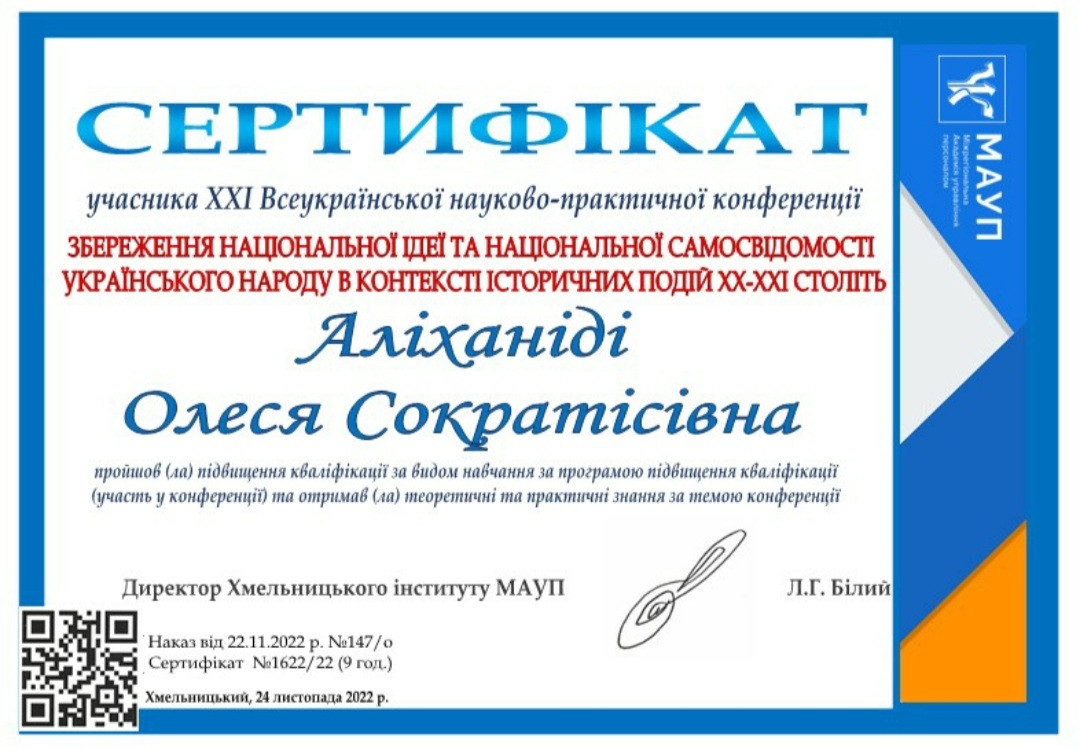 Здобувачі першого (бакалаврського) рівня вищої освіти, ОПП Середня освіта (Українська мова і література) 2-го року навчання Олеся Аліханіді, Валерія Швайка, Лариса Шелест та ОПП Середня освіта (Історія) 1-го року навчання Руслана Корнійчук, – члени наукового гуртка «Південноукраїнські наукові студії» (керівник – проф. Оксана Петінова) взяли участь у ХХІ Всеукраїнській науково-практичній конференції «Збереження національної ідеї та національної самосвідомості українського народу в контексті історичних подій ХХ – ХХІ століть», що була проведена на базі Хмельницького інституту МАУП 24 листопада 2022 року. Студенти висвітлили такі теми як «Україна у другій світовій війні 1939 – 1945 рр.», «Соціальна проблема операції «ВІСЛА»», «Висвітлення голодомору 1932 – 1933 років у літературі».