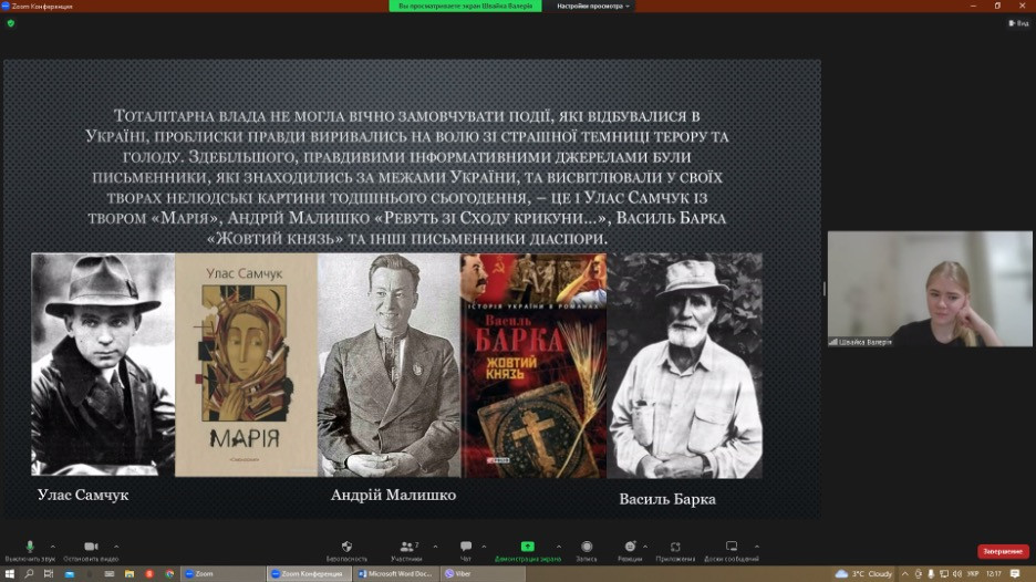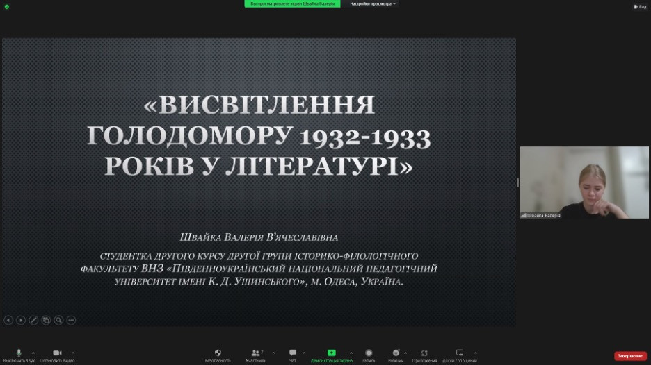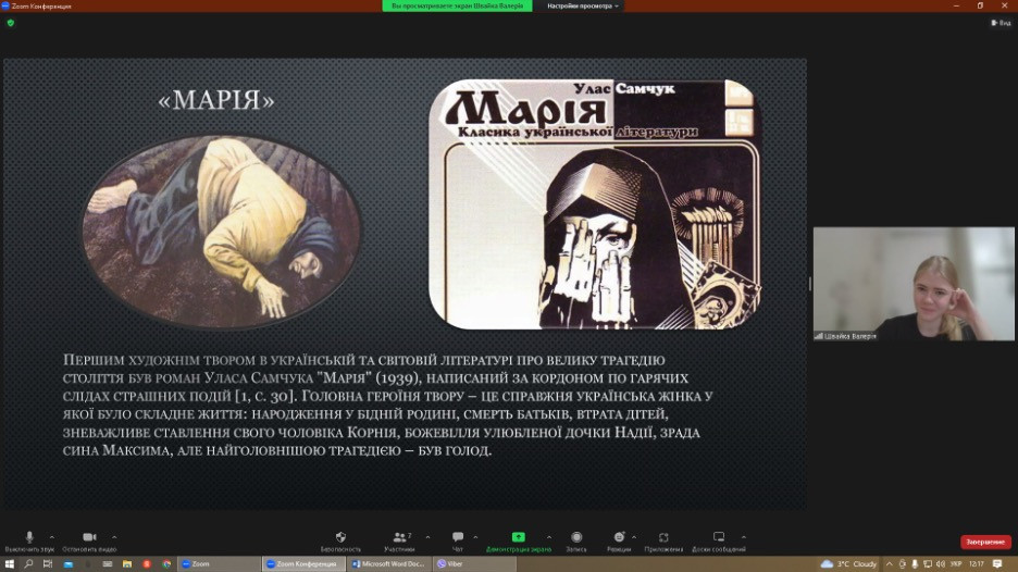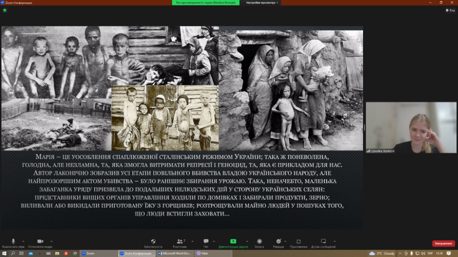28 листопада 2022 року було проведено відкритий захід до Дня пам’яті жертв Голодомору зі здобувачами першого (бакалаврського) рівня вищої освіти ОПП Середня освіта (Українська мова і література). Організатор –викладач Оксана Петінова, д.філос.н., професор кафедри філософії, соціології та менеджменту соціокультурної діяльності. У заході взяли участь студенти 2 курсу 2 групи історико-філологічного факультету. Виступила Валерія Швайка з доповіддю та презентацією на тему «Висвітлення голодомору 1932 – 1933 років у літературі». Приділено увагу демонстрації знищення українського народу через геноцид, факти якого були збережені в архівній документації, пам’ятках культури та літератури. Валерія показала нелюдські картини тодішнього минулого на прикладі літературної спадщини Уласа Самчука «Марія», Андрія Малишка «Ревуть зі Сходу крикуни…», Василя Барки «Жовтий князь» та інших письменників. Було приділено увагу філософським екзистенційним питанням проблематики. В обговоренні та у дискусії взяли участь Дар’я Неліпович, Єлизавета Педченко, Анна Пєтіна, Єлизавета Ткаченко та Катерина Шпілєвая.
