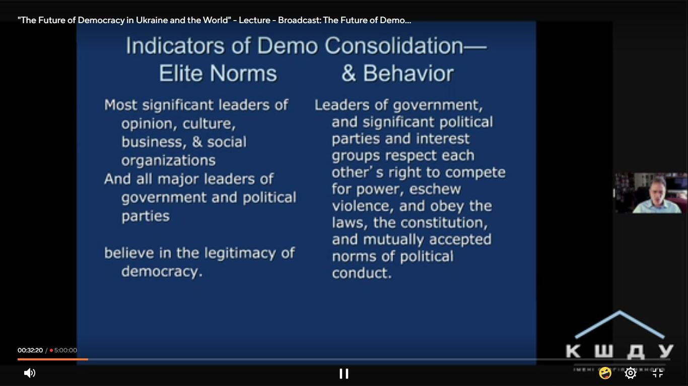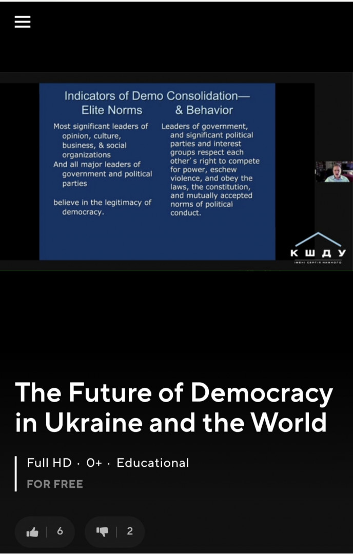 1 березня 2023 року науково-педагогічні працівники кафедри філософії, соціології та менеджменту соціокультурної діяльності та здобувачі третього (освітньо-наукового) рівня вищої освіти (Віолета Світлицька, Ігор Семенов, Інна Федорова, Людмила Городнюк та інші) й гарант ОНП Філософія (проф. Оксана Петінова) долучилися до перегляду відкритої онлайн трансляції лекції Ларрі Даймонда на тему «Майбутнє демократії в Україні та світі», що була проведена в Київській Школі Державного Управління імені Сергія Нижного для здобувачів та співробітників, а також всіх бажаючих. Ларрі Даймонд – визнаний професіонал, всесвітньо відомий фахівець, професор соціології та політичних наук Стенфордського університету, де він викладає курси з демократії, демократичного розвитку та американської зовнішньої політики. Обіймав посади радника багатьох урядових та міжнародних організацій, включаючи державний апарат США, ООН, Світовий банк та Агенство США з міжнародного розвитку. В рамках заходу розглядалися питання розуміння цінностей та принципів сучасної демократії, проаналізовано ключові виклики та сучасної демократії та тренди демократизації, пошук адекватних відповідей на них. Значну увагу було приділено питанню євроінтеграції, демократичних процесів в Україні в рамках війни з росією, окресленню перспектив майбутнього демократії в Україні та світі.