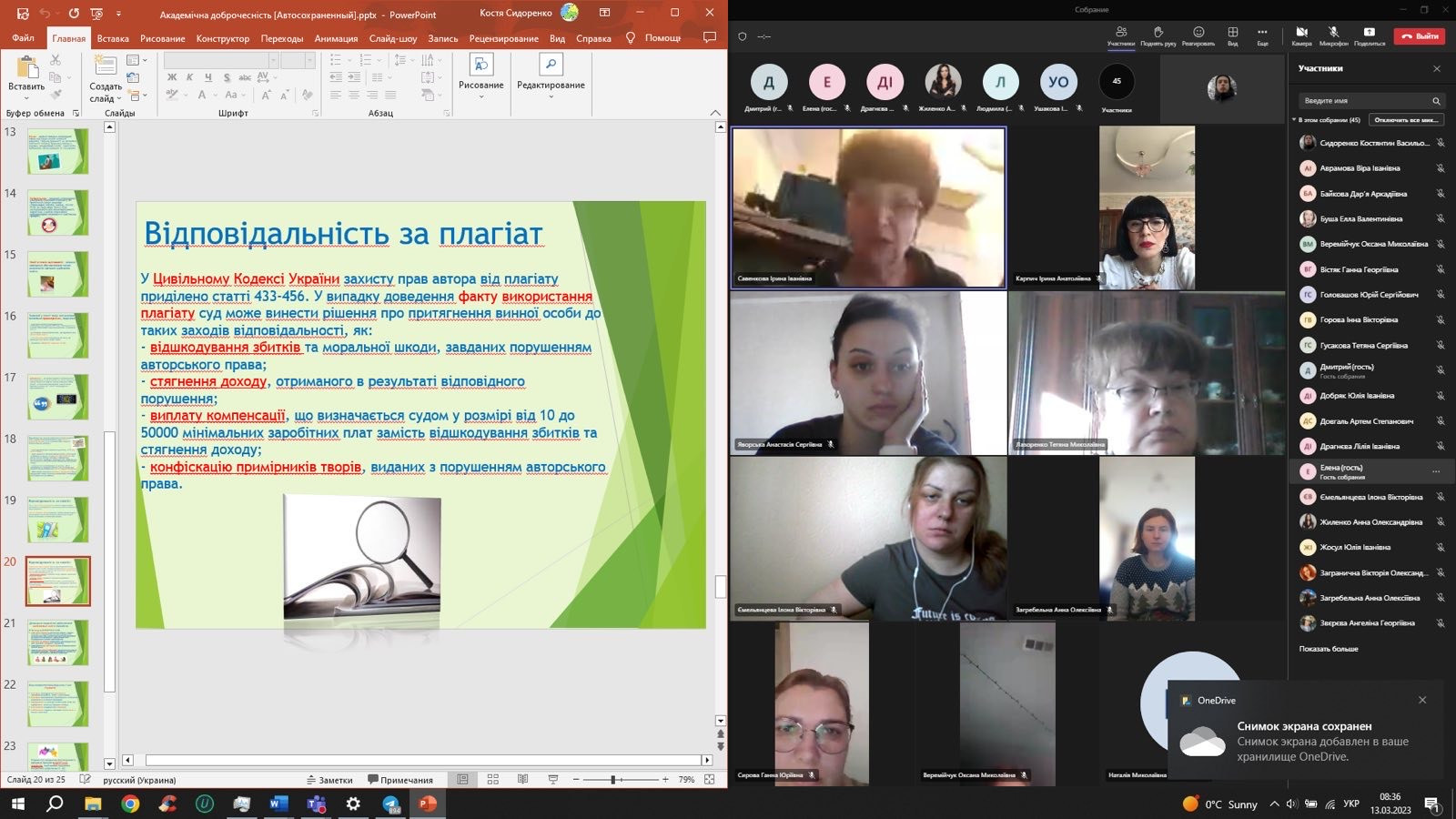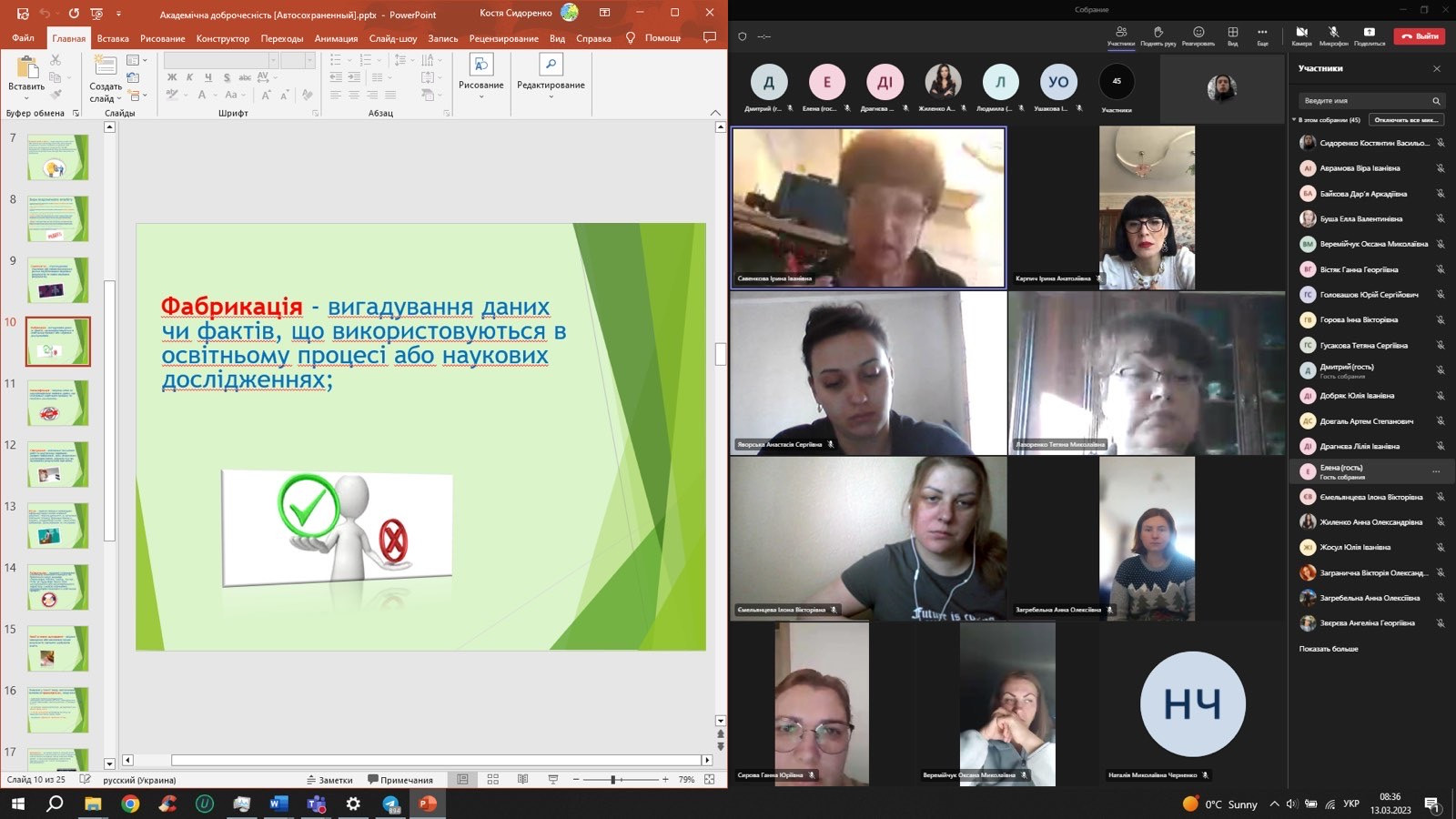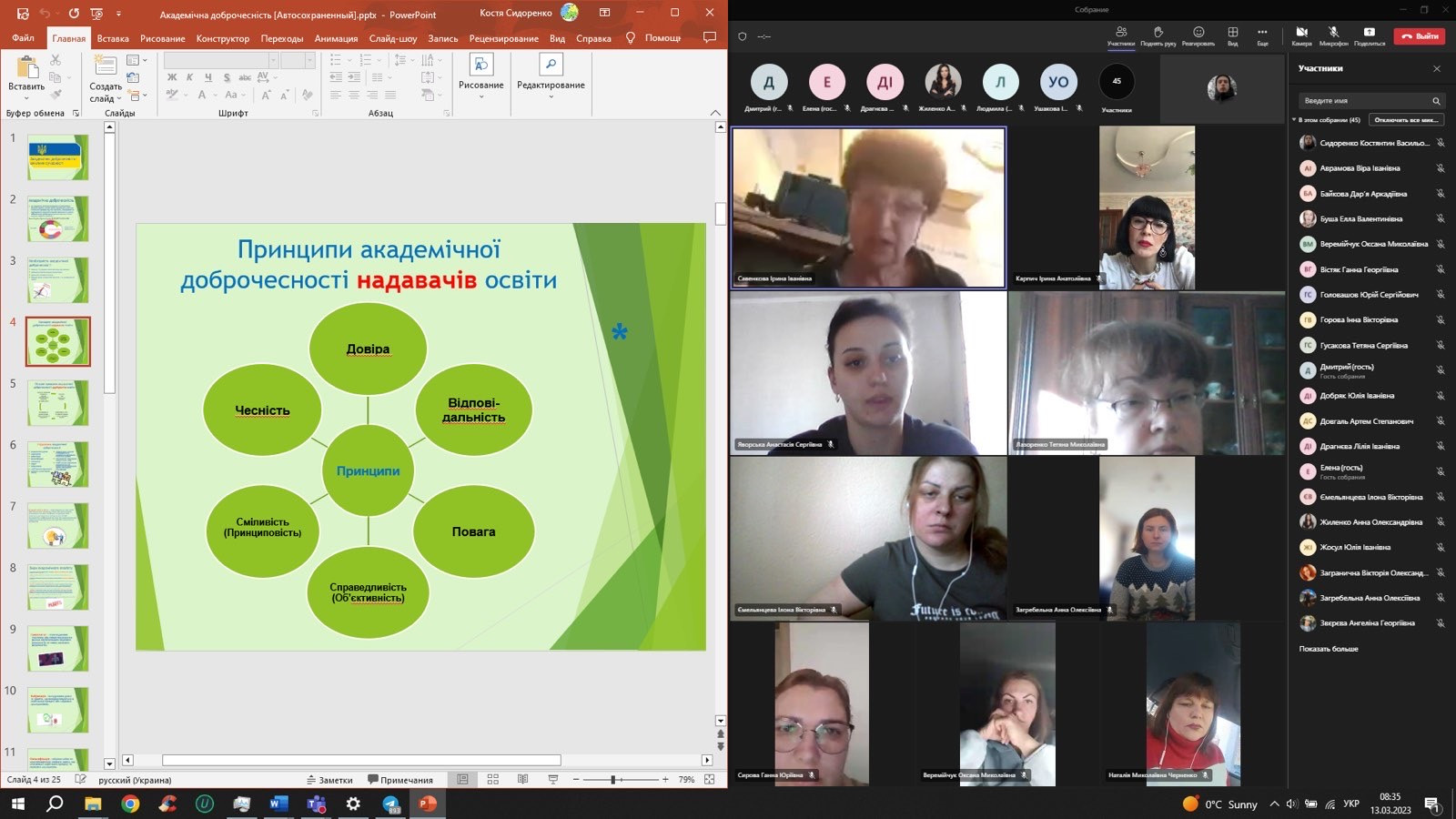 13.03 2023 року викладачами кафедри психіатрії, медичної та спеціальної психології організовано та проведено кураторську годину у дистанційному форматі з теми «Академічна доброчесність: виклики сучасності» зі здобувачами магістрами першого року навчання 053 «Психологія (Клінічна та реабілітаційна)» денної та заочної форми навчання соціально-гуманітарного факультету ДЗ Південноукраїнського національного педагогічного університету імені К. Д Ушинського.
