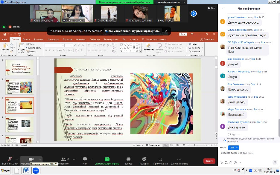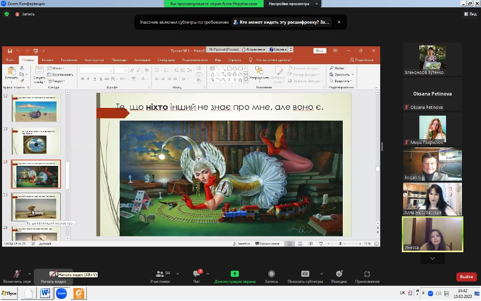 15 березня 2023 року на запрошення докт. філос. н., доц., завідувачки кафедри загальнонаукових соціальних та поведінкових дисциплін Алли Нерубаської, випускниці спеціалізованої ученої ради Д 41.053.02 із захисту дисертацій на здобуття наукового ступеня доктора (кандидата) філософських наук за спеціальністю – 09.00.03 – «Соціальна філософія та філософія історії» Університету Ушинського здобувачі третього (освітньо-наукового) рівня вищої освіти ОНП Філософія (Віолета Світлицька, Елеонора Бутенко, Інна Федорова, Людмила Городнюк, Олена Парадюк, Іванна Ніколаєва та інші) і гарант ОНП «Філософія» Оксана Петінова взяли участь у Всеукраїнській лекції-тренінгу на тему: «Психологія в мистецтві та мистецтво в психології – частина 3: адаптація до складних умов життя та праці», присвяченому 25-річчю Одеського інституту ПрАТ «ВНЗ «МАУП»».
