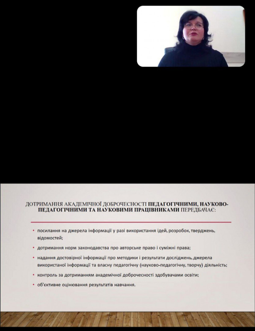 Було обговорено питання дотримання принципів академічної доброчесності – що вважається порушення академічної доброчесності, до якої відповідальності притягуються порушники академічної доброчесності; відповідні правові підстави та наявні нормативні акти, особливості академічного плагіату та що вважається недобросовісним використанням власної освітньої, наукової, творчої діяльності тощо.