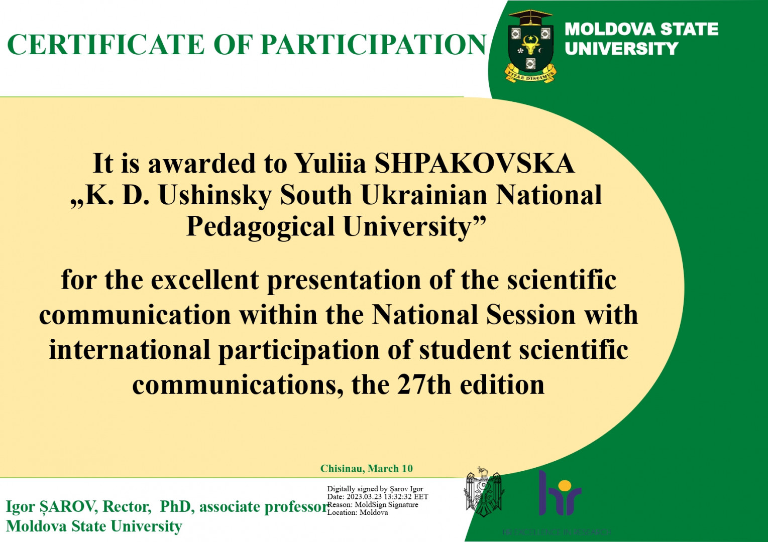 За результатами участі у Міжнародній науково-практичній конференції "National session with international participation of student scientific communications, 27th edition", яка відбулась у Moldova State University, здобувачі першого (бакалаврського) рівня вищої освіти 4 року денної форми навчання за спеціальністю 053 Психологія отримали сертифікати.