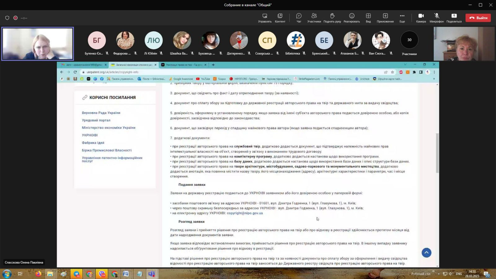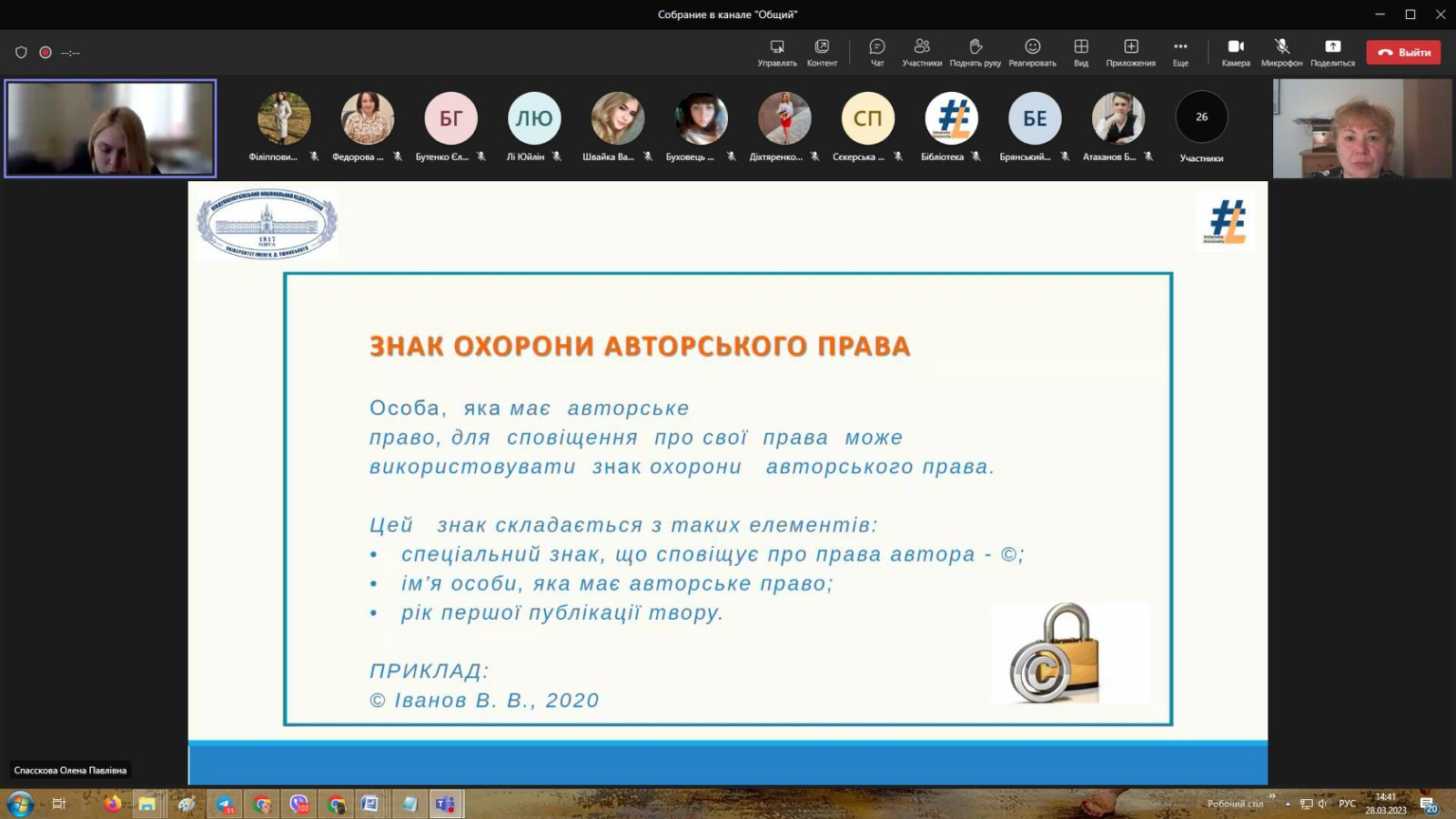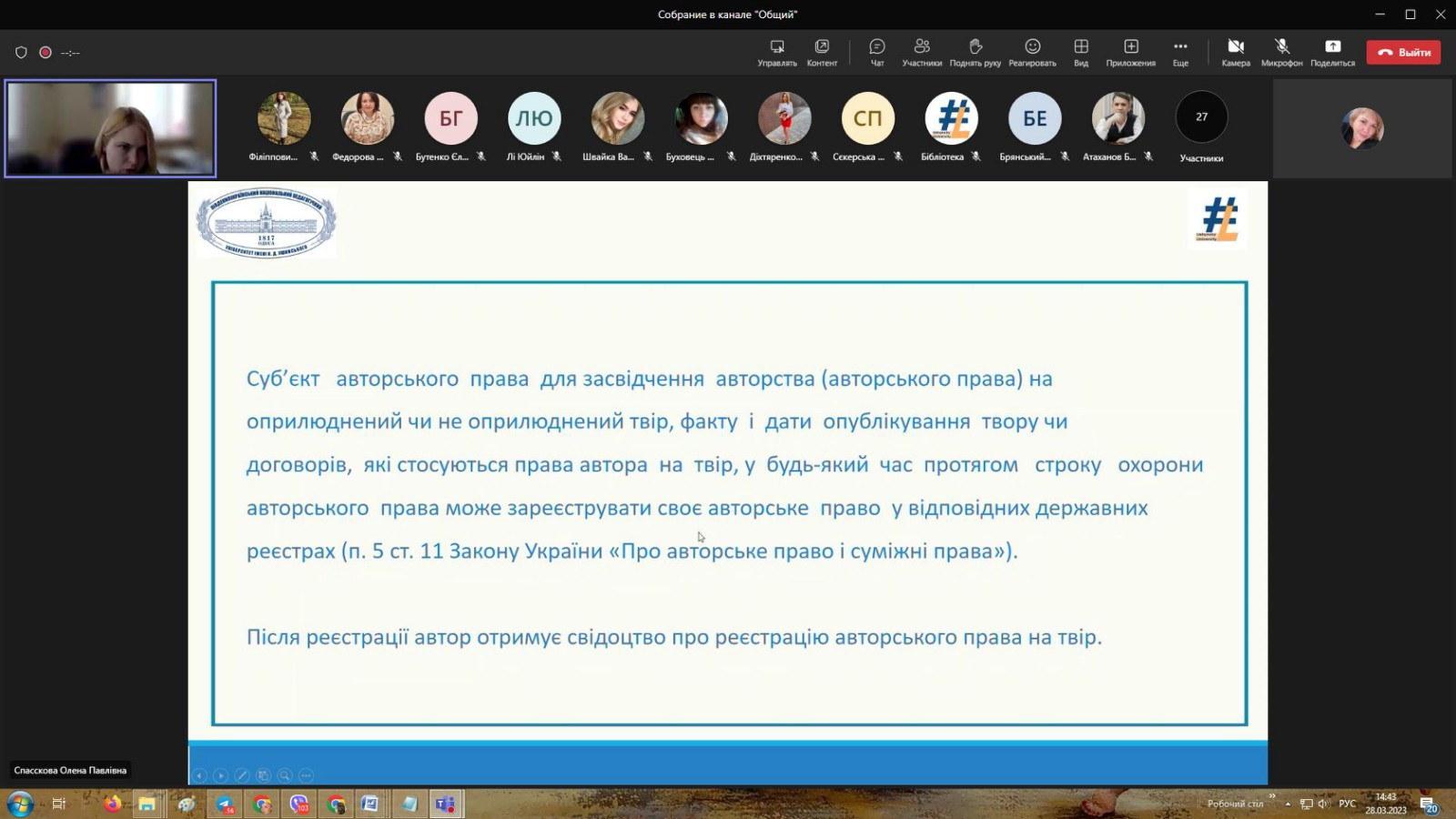 28 березня 2023 року здобувачі третього (освітньо-наукового) рівня вищої освіти ОНП «Філософія» (Інна Федорова, Людмила Городнюк, Елеонора Бутенко та інші) та науково-педагогічні працівники кафедри філософії, соціології та менеджменту соціокультурної діяльності долучилися до вебінару «Реєстрація авторського права на науковий твір
