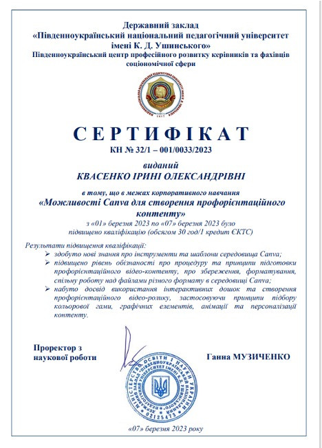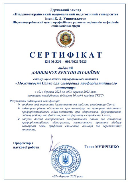 07 березня 2023 року на базі Південноукраїнського центру професійного розвитку керівників та фахівців соціономічної сфери Університету Ушинського (керівник – професор Наталія Черненко) завершилося корпоративне навчання «Можливості Canva для створення профорієнтаційного контенту» для студентів, аспірантів, співробітників та науково-педагогічних працівників Університету Ушинського, що розраховано на 1 кредит (30 годин) із відповідним сертифікатом.