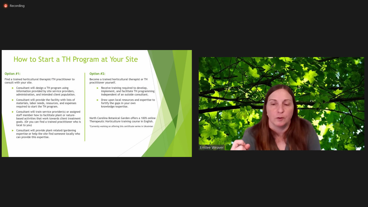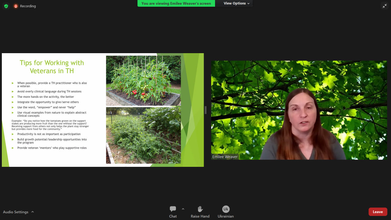 Учасники вебінару ознайомилися програмами терапевтичної хортикультури для ветеранів. Зокрема, 1) програма HOPE GROWS у ботанічному саду Cape Fear у Північній Кароліні, США створена спеціально для ветеранів проєкту Wounded Warrior, які мають поранення, травми або проходять шлях зцілення. Ця програма пропонує практичні заняття з терапевтичного садівництва, які адаптуються до різних рівнів фізичної спроможності. Ці заняття спрямовані на зцілення, емоційну підтримку та відновлення. 2) Програма Chatfield Farms Veterans Farm Program у місті Денвер, Штат Колорадо, США. Учасники-ветерани цієї програми розвивають практичні навички, навчаються керувати невеликою фермою, взаємодіяти з різними громадами, налагоджувати стосунки з іншими ветеранами тощо.