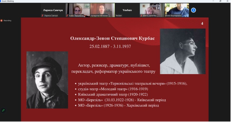 В рамках реалізації договору про співпрацю між ЗВО-партнерами НПП кафедри філософії, соціології та менеджменту соціокультурної діяльності, зокрема, гарант (проф. Євген Борінштейн) та здобувачі ОПП «Культурологія», гарант (проф. Олена Лісеєнко) та здобувачі ОПП «Менеджмент соціокультурної діяльності», гарант (проф. Оксана Петінова) та здобувачі ОНП «Філософія», а також доц. Зоя Атаманюк, викл. Лариса Самчук, доц. Галина Врайт, доц. Тетяна Поплавська долучилися до відкритої онлайн-лекції «Культурні традиції українського театру в творчості Леся Курбаса», яку провела Катерина Матвєєва (Інститут світової культури кафедри філософії і педагогіки Дніпровської політехніки).