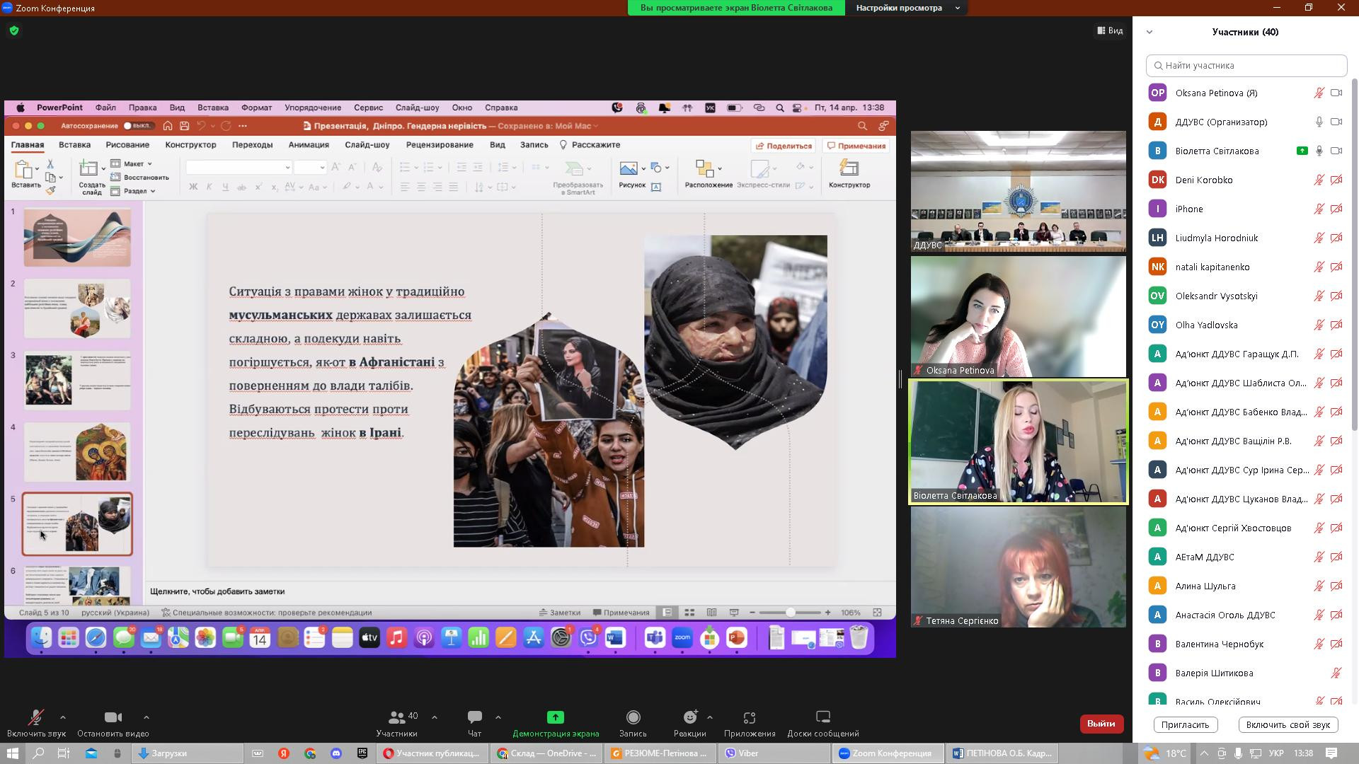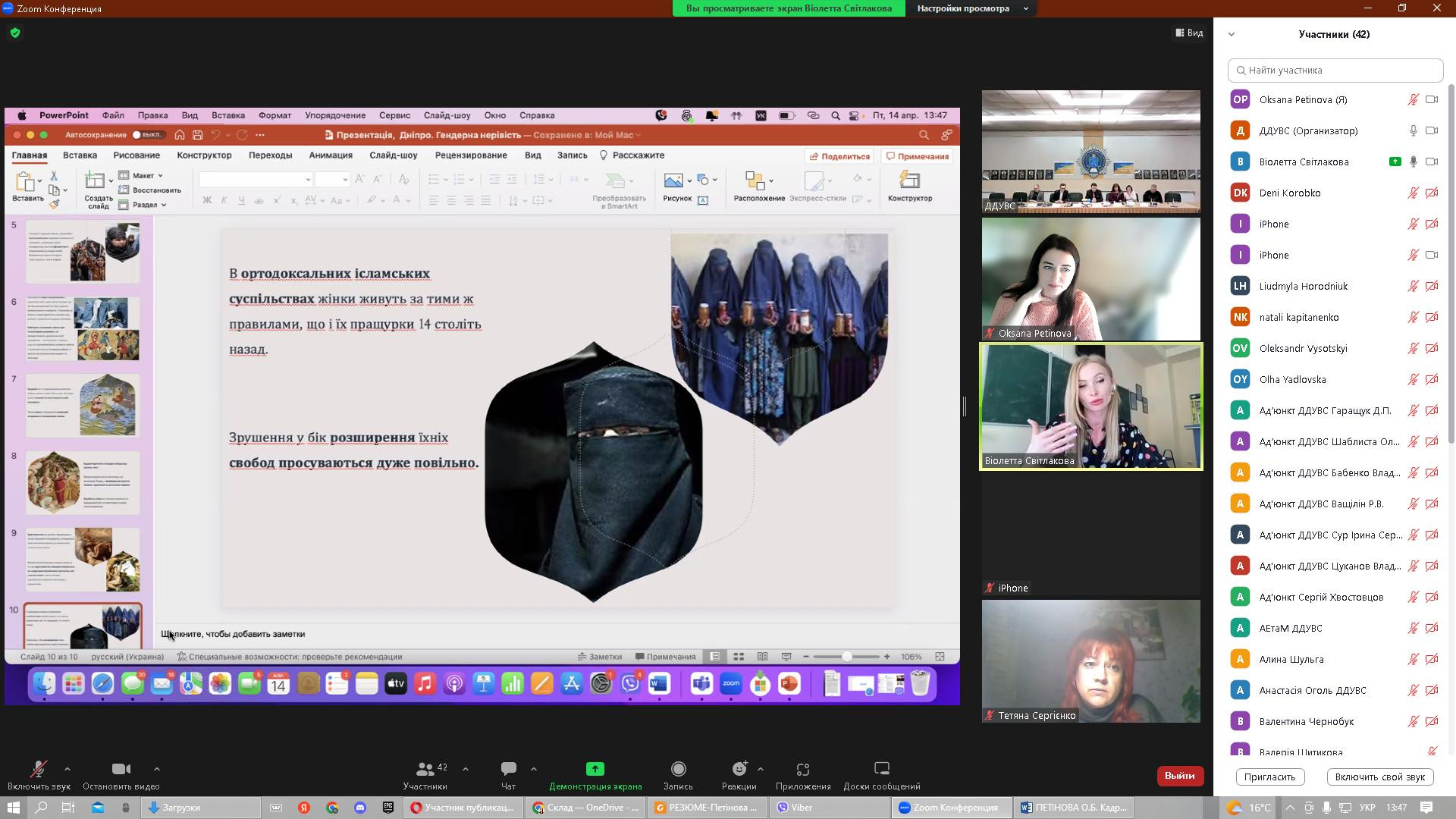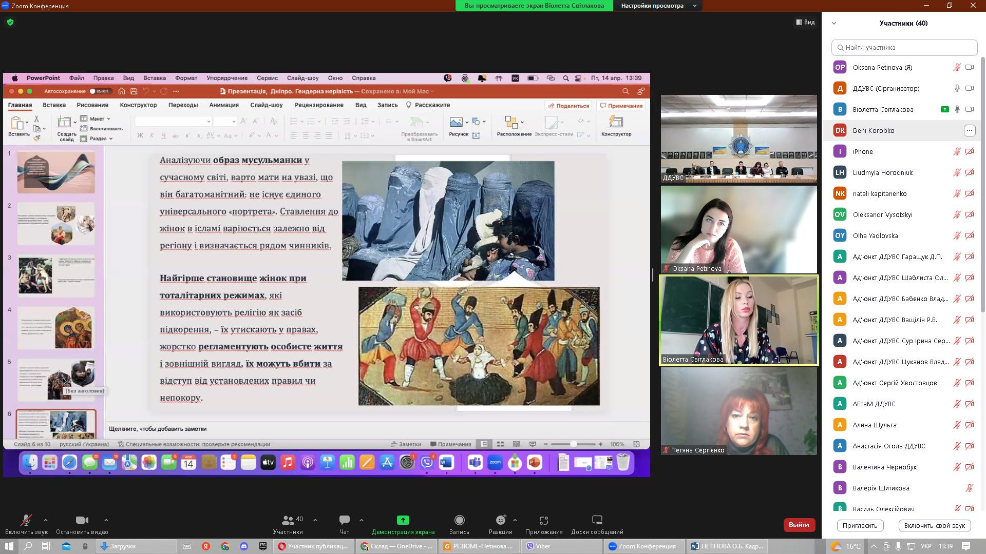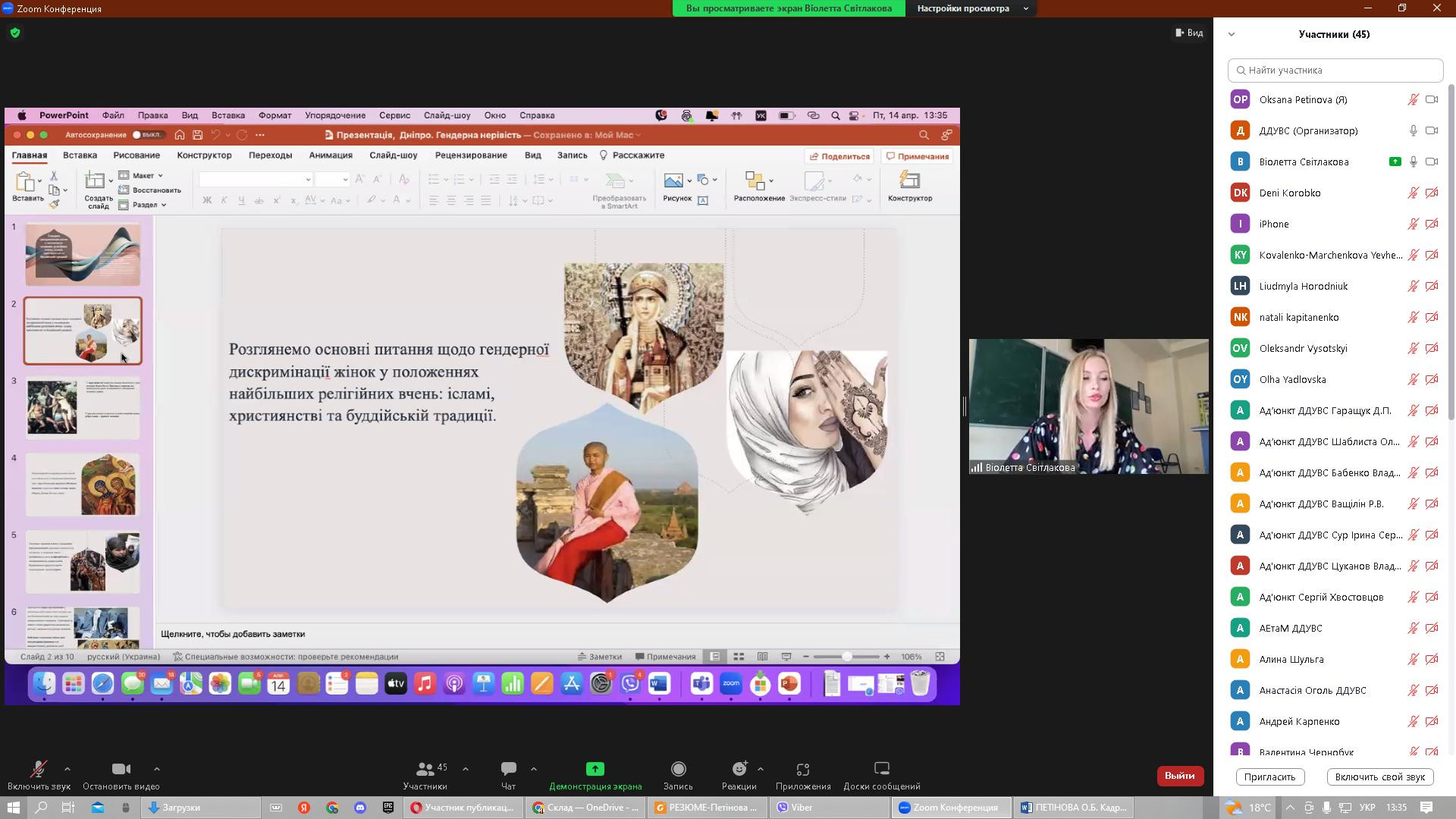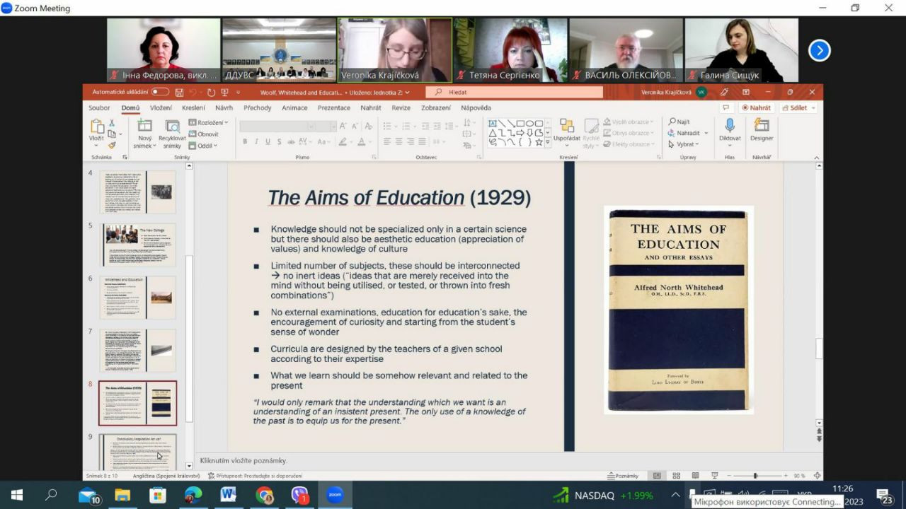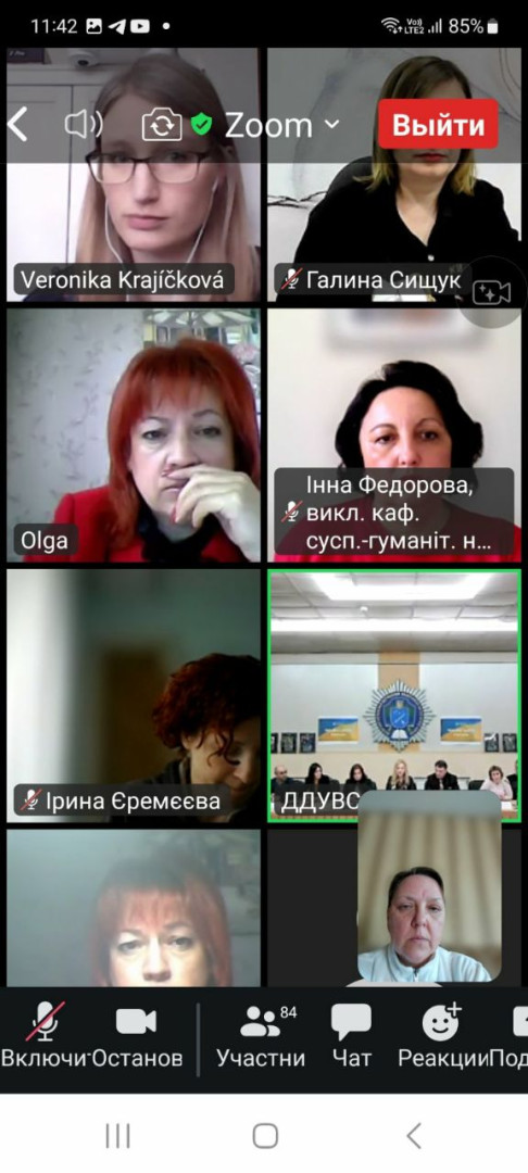 14 квітня 2023 року в рамках реалізації договору про співпрацю між ЗВО-партнерами НПП кафедри філософії, соціології та менеджменту соціокультурної діяльності, здобувачі першого (бакалаврського) та третього (освітньо-наукового) рівня вищої освіти Університету Ушинського взяли участь у міжнародній науково-практичній конференції «Соціально-гуманітарні виміри правової держави», організатором якої є кафедра міжнародних відносин та соціально-гуманітарних дисциплін Дніпропетровського державного університету внутрішніх справ (ЗВО-партнер). Головною метою конференції було обговорення актуальної інформації та обміну практичним досвідом щодо перспектив розвитку соціально-гуманітарних наук в умовах воєнного стану. Серед тематичних напрямів конференції - проблеми держави та суспільства в умовах війни; правова держава та громадянське суспільство; трансформація влади та законодавства в Україні як фактор європейського розвитку українського суспільства; глобальні політико-правові проблеми міжнародного простору; національні пріоритети гуманітарного розвитку України; гендерна рівність як складова правової держави. Зокрема, з апробацією проміжної наукової розвідки дисертаційного дослідження виступила здобувачка 1-го року навчання Віолета Світлицька з темою «Гендерна дискримінація жінок у положеннях основних релігійних вчень: ісламі, християнстві та буддійській традиції». До обговорення залучились представники наукового співтовариства різних ЗВО, дискусійними виявились аспекти гендерної дискримінації жінок в ісламі. Активну участь у конференції взяли аспіранти Інна Федорова, Марина Арапакі, Ігор Семенов та Людмила Городнюк.