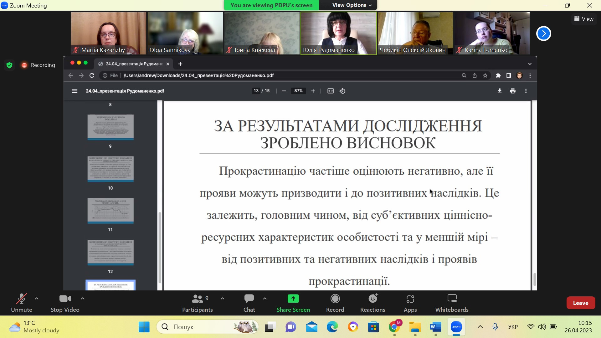 В Університеті Ушинського 26 квітня 2023 року на платформі Zoom відбувся успішний захист дисертації аспірантки Юлії РУДОМАНЕНКО з теми «Психологічні особливості прокрастинації особистості: позитивні та негативні прояви і наслідки» на здобуття наукового ступеня доктора філософії зі спеціальності 053 Психологія.