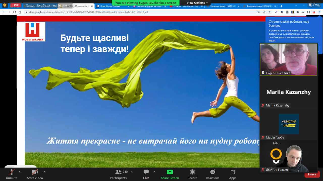 На заході, який відбувався на платформі Zoom, було розглянуто специфіку використання цифрових технологій у створенні електронного освітнього середовища закладу освіти. Описано та наведено приклади використання програм для вирішення певних прикладних завдань, як-то складання розкладу занять тощо.