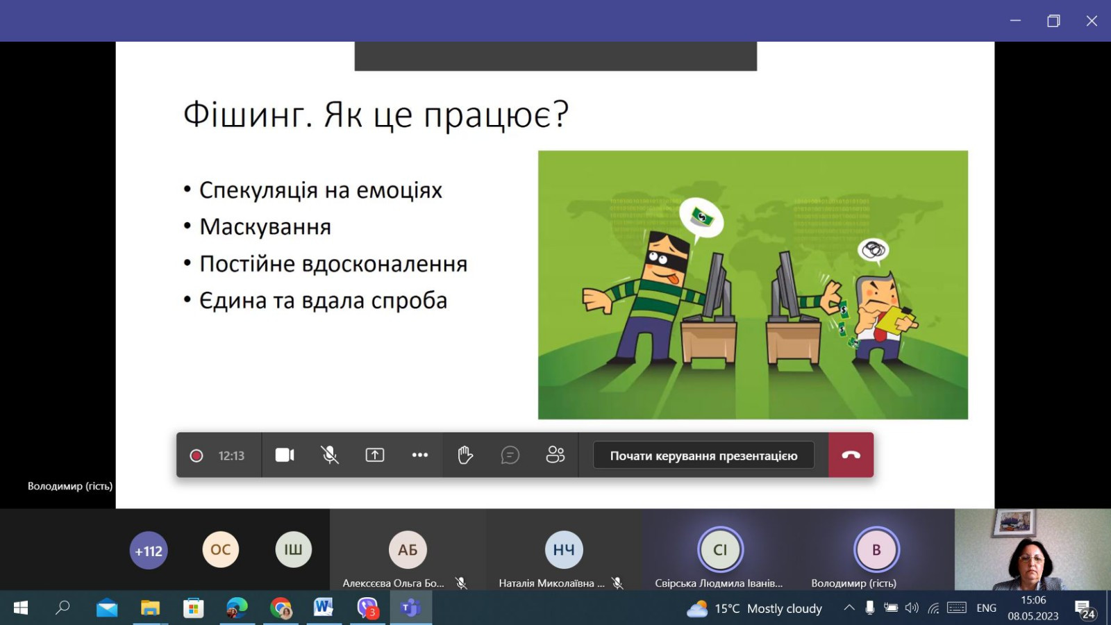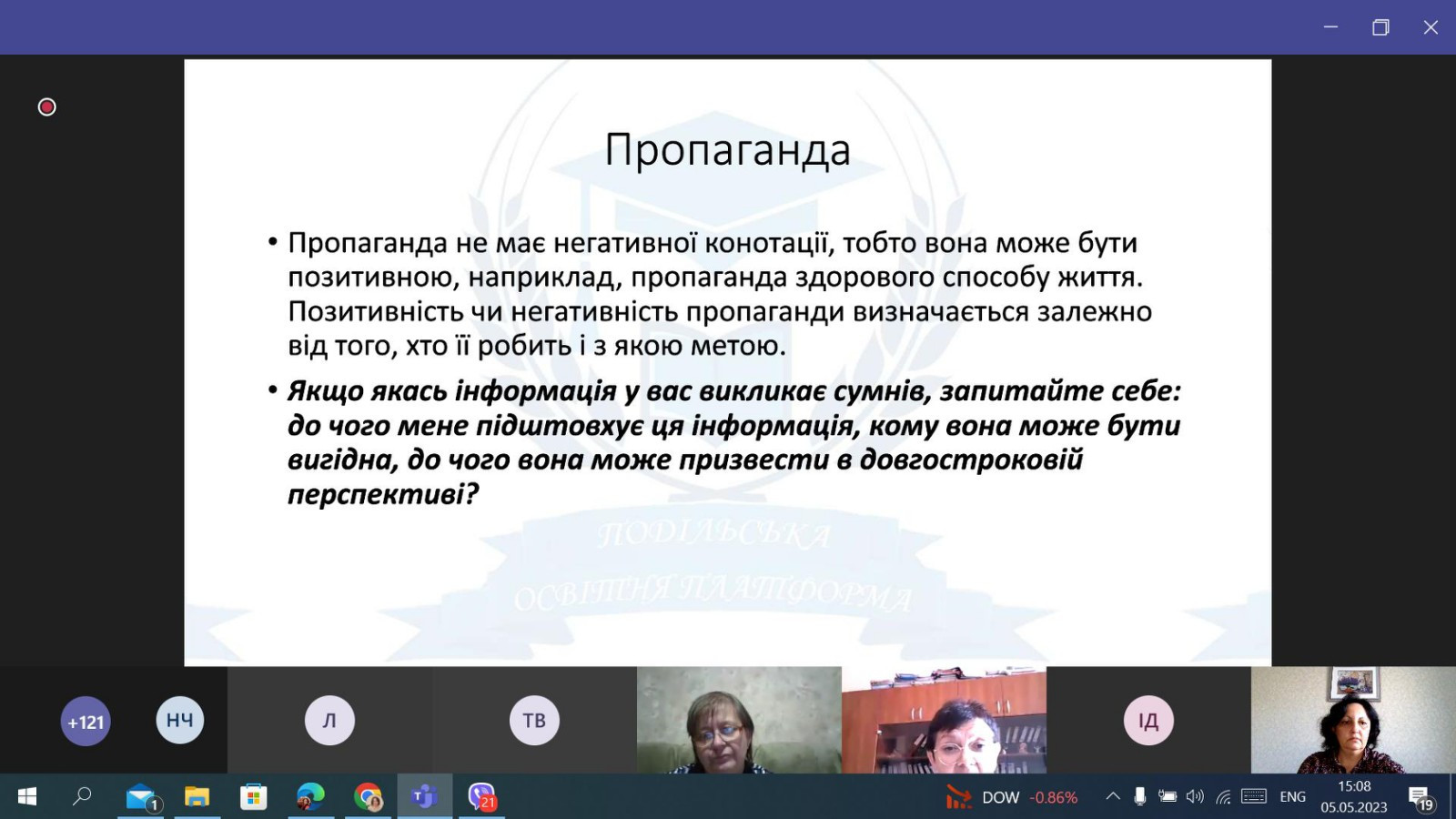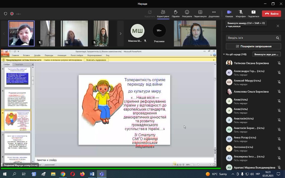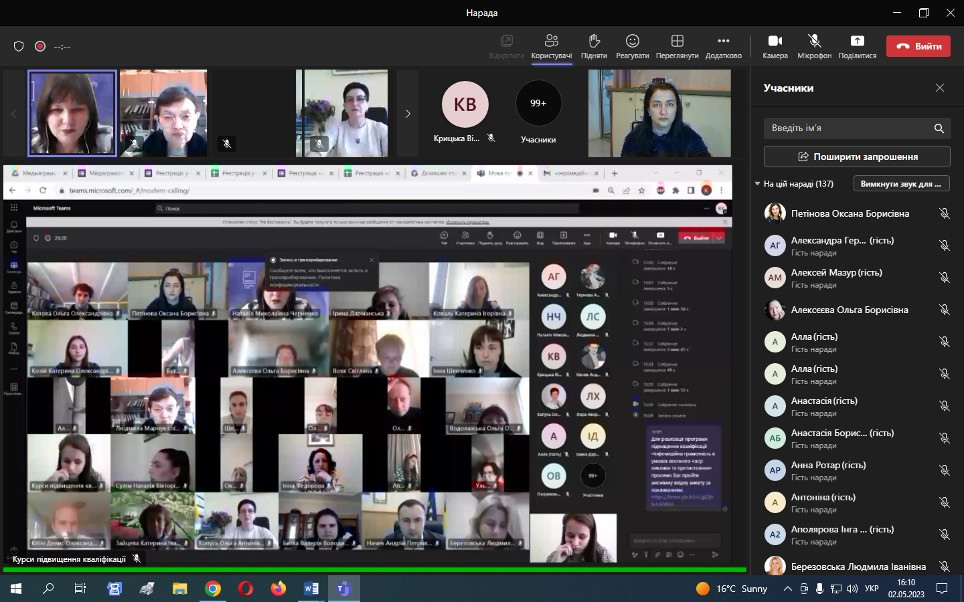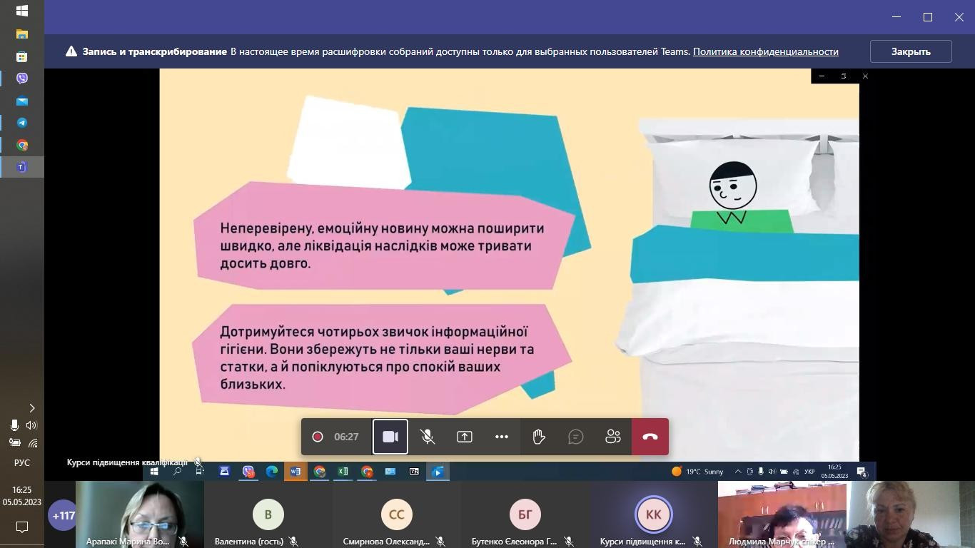 НПП кафедри філософії, соціології та менеджменту соціокультурної діяльності (проф. Петінова О. Б., доц. Начев А. П., доц. Врайт Г. Я., викл. Самчук Л. С.), здобувачі третього (освітньо-наукового рівня) вищої освіти ОНП «Філософія» (Інна Федорова, Віолета Світлицька, Марина Арапакі, Людмила Городнюк, Елеонора Бутенко, Ігор Семенов та інші), а також здобувачі першого (бакалаврського) рівня вищої освіти ОПП «Менеджмент соціокультурної діяльності» взяли участь у програмі підвищення кваліфікації за темою «Інфомедійна грамотність в умовах воєнного часу: виклики та протистояння».Пройшли такі заходи: вебінар «Мова толерантності та ворожості: виклики під час війни» (02.05.2023 р.); воркшоп «Поняття інформаційної війни. Упередження /стереотипи/ дискримінація. Глосарій термінів» (04.05.2023 р.); тренінг «Пропаганда та дезінформація як інструментарій впливу й уміння протистояти їм» (05.05.2023 р.); тренінг «Загрози в кіберпросторі: фішинг, скам, фейкньюс; захист дітей в кіберпросторі» (08.05.2023 р.). Програма підвищення кваліфікації організована на базі Південноукраїнського центру професійного розвитку керівників та фахівців соціономічної сфери у межах проєкту «Інформаційна безпека: медіаграмотність в умовах воєнного часу» за підтримки благодійного фонду «Академія української преси».