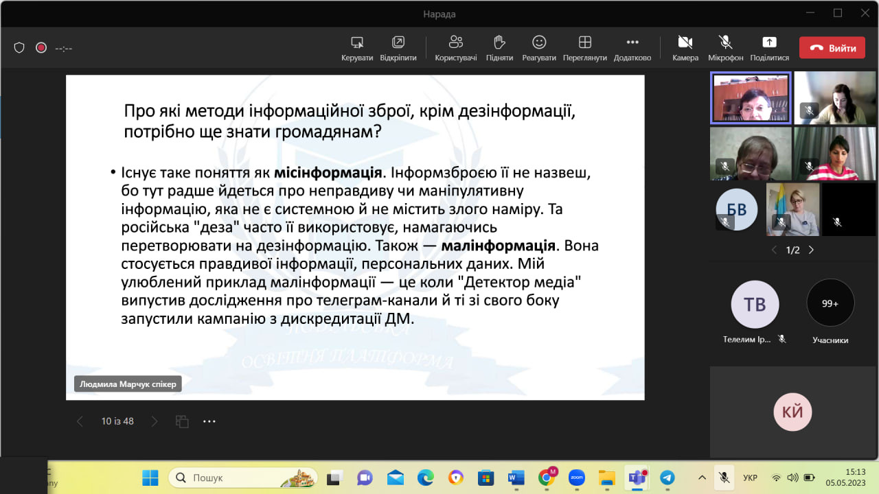 Спікером заходу виступила Людмила МАРЧУК, професор, завідувачка кафедри української мови Кам’янець-Подільського національного університету імені Івана Огієнка. Було розкрито історичний контекст інформаційних воєн; як встановити фейкового новин; як дотримуватися інформаційної гігієни. Було також розглянуто основні фейки повномасштабної російсько-української війни, як виявляти та розвінчувати дезінформацію та пропаганду тощо.