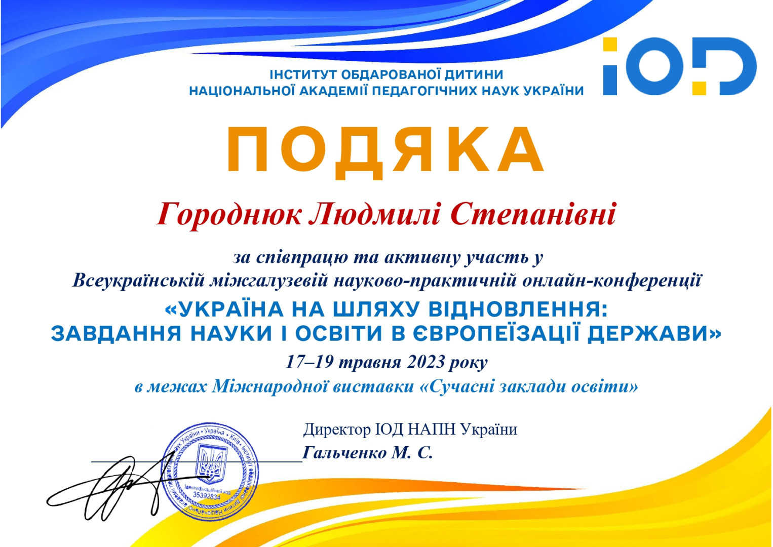 В межах реалізації договору про співпрацю здобувачка третього (освітньо-наукового) рівня вищої освіти ОНП «Філософія» Людмила Городнюк взяла участь у Всеукраїнській міжгалузевій науково-практичній конференції «Україна на шляху відновлення: завдання науки і освіти в європеїзації держави», що проходила в рамках Міжнародної виставки «Сучасні заклади освіти» на базі наукової установи-партнера «Інститут розвитку дитини НАПНУ України». На засіданні секції «Інновація VS традиція: філософський, історіософський, історичний дискурс» Людмила Городнюк представила доповідь на тему «Людинознавство і метапізнання як надважливі освітні категорії сьогодення» та апробувала проміжні результати свого дисертаційного дослідження. Чи отримує сучасний школяр певні знання, щоб мати уяву і міркувати про свою власну природу – знання об'єктивне і зрозуміле, про людину і світ, таке, що здатне стати джерелом пізнання, аналізу, порівняння, досвіду? Чи усвідомлюють наші діти, що людська природа – це надважливий предмет і об'єкт нашого осягання, бо прожити вік серед людей – це і головне призначення всіх і кожного? Людмила виступила із пропозицією впровадження в школі «Людинознавства» – комплексного знання, яке б інтегрувало ресурс з філософії, психології, психофізіології, антропології, соціології, біології, де центральними опціями стали б важливі і реальні життєві категорії: сенс життя, образ майбутнього, здоров'я і нервова система, соціальні ролі і зв'язки, мислення, призначення і світогляд, відносини і стосунки, втрати і розлучення, життєві виклики та стратегії подолання. Така навчальна дисципліна, могла б стати полем для пізнання і обговорення життя, можливих сценаріїв, хабом для прийняття рішень. Тема викликала значний інтерес, а Людмила отримала подяку за неочікувану і цікаву пропозицію. Вітаємо з результативним виступом та з нагородою!