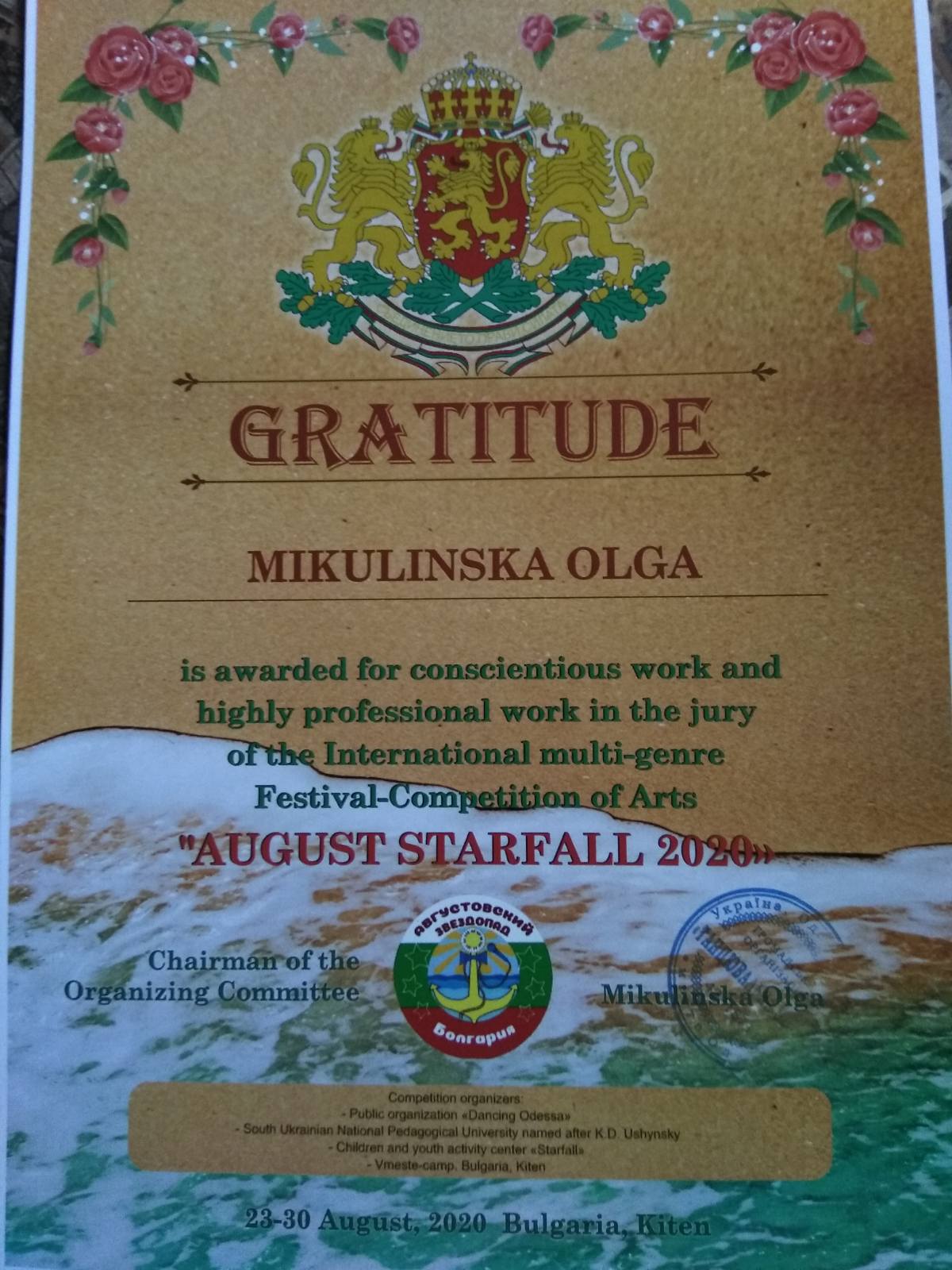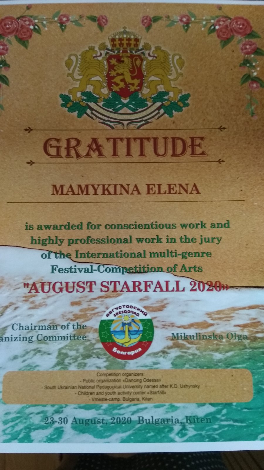 Університет Ушинського виступив організатором Міжнародного арт-проєкту в рамках проведення Міжнародного фестивалю-конкурсу «Пори року. Серпневий зорепад» в Болгарії, який проходив ум. Кітен з 23 по 30 серпня. Активну участь в реалізації проєкту взяли викладачі факультету музичної та хореографічної освіти: голова Міжнародного конкурсу «Пори року» доцент кафедри музичного мистецтва і хореографії доцент Мікулінська О.С., доцент кафедри музично-інструментальної підготовки Горожанкіна О.Ю. та ст.викл. кафедри теорії музики і вокалу Мамикіна О.А.