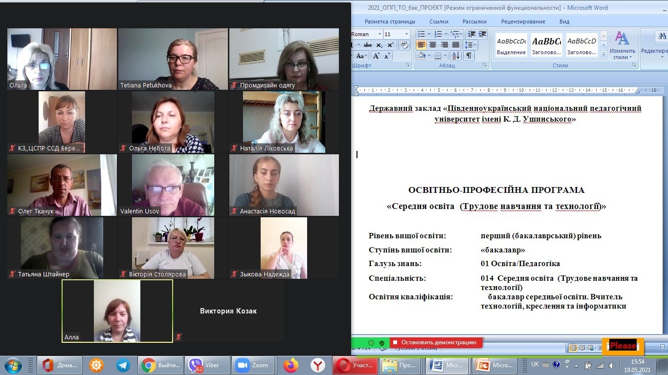 19 травня 2021 року було проведено нараду щодо обговорення проєктів ОПП «Середня освіта (Трудове навчання та технології)» першого (бакалаврського) та другого (магістерського) рівнів спеціальності 014 Середня освіта (Трудове навчання та технології) членами робочої групи та представниками освітніх установ зош І-ІІІ ст. №2 міста Володимир-Волинського Волинської області, Володимир-Волинського педагогічного фахового коледжу ім. А. Ю. Кримського Волинської обласної ради, Одеських міжшкільних ресурсних центрів №2 та № 3 Одеської міської ради, опорного закладу освіти «Першотравневий ліцей» Визирської сільської ради Одеського району Одеської області, КЗ «Центр соціально-психологічної реабілітації дітей служби у справах дітей Березівської РДА», зош І-ІІІ ступенів №79 міста Одеси. Під час зустрічі було визначено, що зміст програм відповідає сучасним потребам закладів освіти та особливість цих програм полягає у наданні можливості здобувачам вищої освіти опанувати теоретичними і практичними курсами через формування в них відповідних компетентностей , що пов’язані з реалізацією професійної діяльності в галузі середньої освіти у сфері технологій та підвищенням її ефективності та бути конкурентоспроможними на ринку праці, програми не мають принципових зауважень і можуть бути впроваджені в освітній процес.