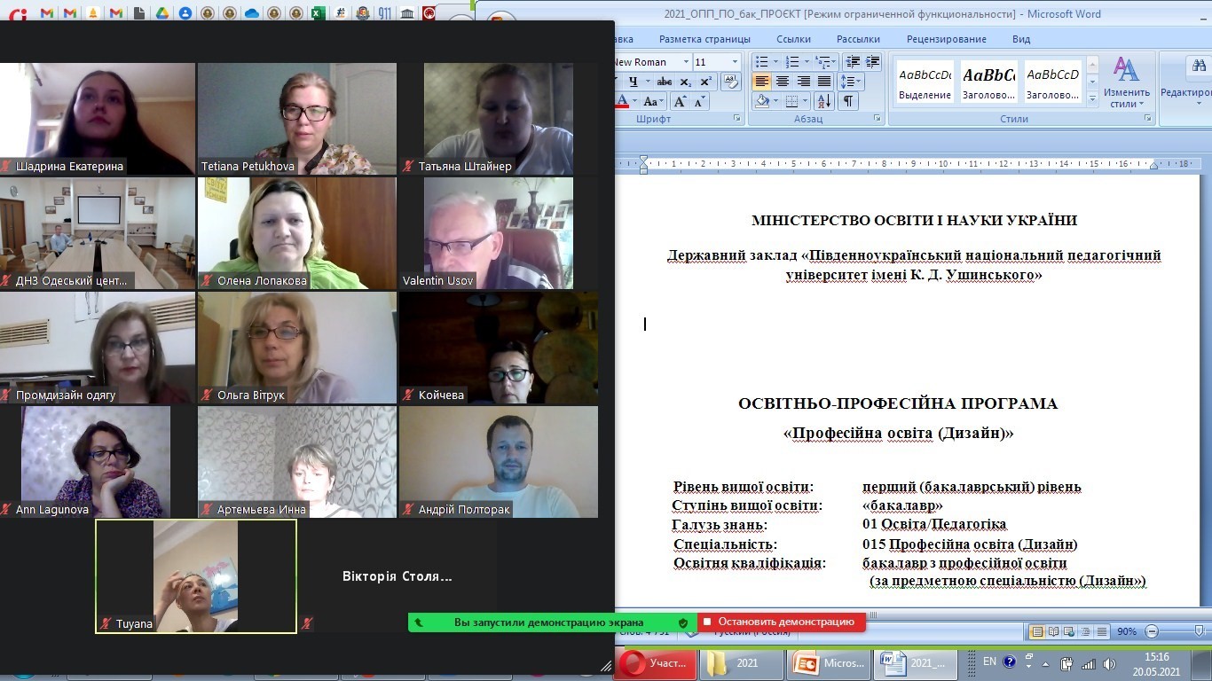 20 травня 2021 року було проведено нараду щодо обговорення проєкту ОПП «Професійна освіта (Дизайн)» першого (бакалаврського) спеціальності 015 Професійна освіта (Дизайн) членами робочої групи та представниками ДНЗ «Одеський професійний ліцей сфери послуг Університету Ушинського», Одеського театрально-художнього фахового коледжу, ДЗ «Одеський центр професійно-технічної освіти державної служби зайнятості», видавництва «Астропринт», ТОВ «Промисловий дизайн одягу». Стейкхолдери зазначили, що вірно спрямований фокус програми на формування та розвиток загальних і професійних компетентностей професійної освіти в дизайні, що відповідають сучасному рівню науки і практики та визначенні підходи щодо виробничої практики забезпечать підготовку майбутніх фахівців у реальному середовищі майбутньої професійної діяльності, а реалізація системного підходу у формуванні навчальних дисциплін фундаментального психолого-педагогічного та дизайнерського спрямування є підгрунтям для подальшого навчання впродовж всього життя, програми не мають принципових зауважень і можуть бути впроваджені в освітній процес