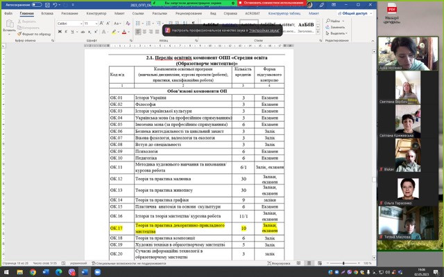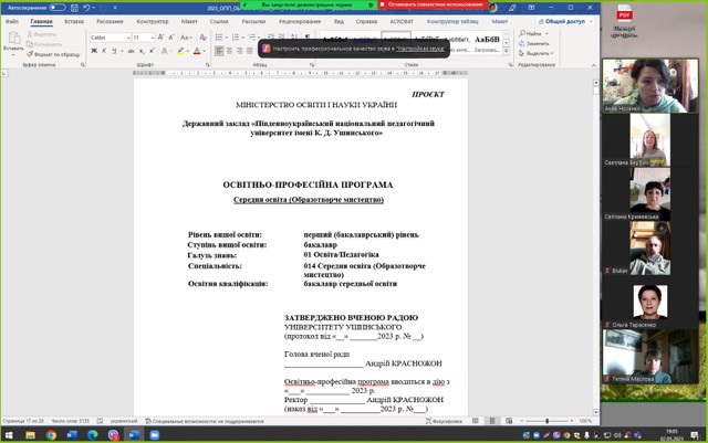 2 травня 2023 року відбулось обговорення проєкту Освітньо-професійної програми «Середня освіта (Образотворче мистецтво)» першого (бакалаврського) рівня за спеціальністю 014 Середня освіта (Образотворче мистецтво) за участю членів робочої групи, викладачів кафедри образотворчого мистецтва та стейкхолдера, Світлани Володимирівни Вербич, заступника директора з навчально-виховної роботи, викладача вищої категорії, викладача-методиста Комунального закладу початкової спеціалізованої освіти «Мистецька художня школа № 2 м. Одеси».