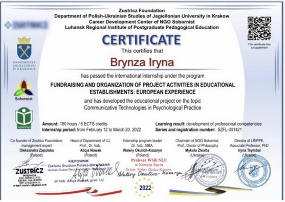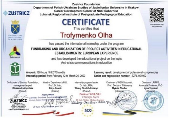 Screenshot_1Міжнародне наукове стажування «Фандрейзинг та організація проєктної діяльності в закладах освіти: європейський досвід» (Польща – Україна), організаторами якого були: фундація «Зустріч» (Польща), кафедра Польсько-Українських Студій Ягеллонського університету (Польща), громадська організація «Соборність» (Україна), Луганський обласний інститут післядипломної педагогічної освіти (Україна) завершилось. Вітаємо викладачів, наукових керівників та аспірантів з успішним завершенням стажування та отриманням сертифікатів!