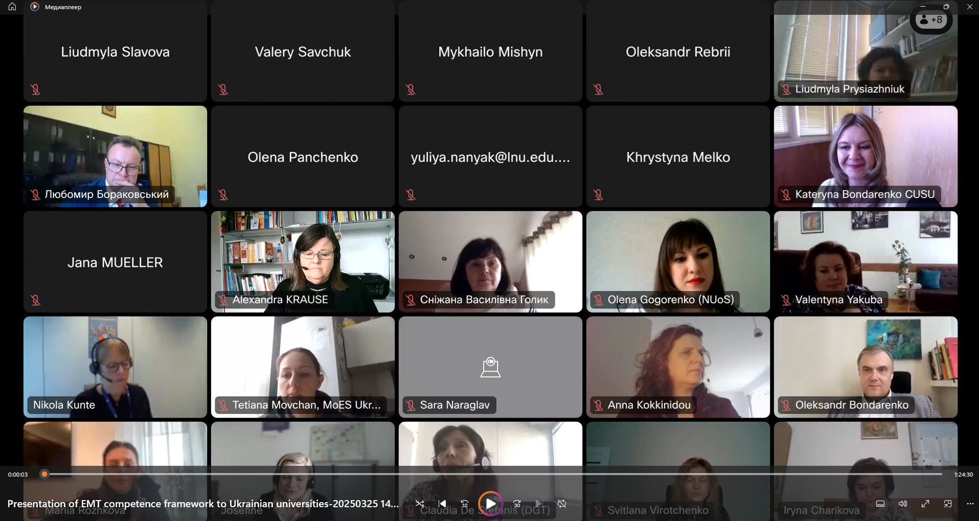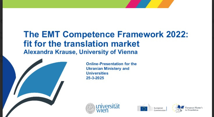 25 березня 2025 року декан факультету іноземних мов, доктор педагогічних наук, професор кафедри перекладу і теоретичної та прикладної лінгвістики Олександра ПОПОВА, завідувачка кафедри перекладу і теоретичної та прикладної лінгвістики, к. філол. н., доцент Ілона ДЕРІК, начальник відділу міжнародних зв’язків, PhD (освітні і педагогічні науки), асистент кафедри перекладу і теоретичної та прикладної лінгвістики Олександра МОРГУН взяли участь у важливій онлайн-зустрічі з представниками Генерального директорату Європейської Комісії з питань перекладу, під час якої була презентована компетентнісна рамка European Master’s in Translation (EMT).