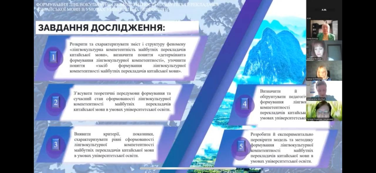 Вітаємо аспірантку Олександру МОРГУН та її наукового керівника проф. Олександру ПОПОВУ з успішним захистом дисертації на здобуття наукового ступеня доктора філософії зі спеціальності 011 Освітні, педагогічні науки» на тему «Формування лінгвокультурної компетентності майбутніх перекладачів китайської мови в умовах університетської освіти».Голова спеціалізованої вченої ради – проф. Алла БОГУШ, опоненти: проф. Оксана АСАДЧИХ (професор кафедри мов і літератур Далекого Сходу та Південно-Східної Азії Київського національного університету імені Тараса Шевченка), проф. Світлана БОДНАР (завідувач кафедри іноземних мов і гуманітарних дисциплін Одеського торговельно-економічного інституту), рецензенти: проф. Тетяна ОСІПОВА та доц. Ольга ТРУБІЦИНА. Актуальність дослідження визначається відповідністю теми дисертації напрямам модернізації освіти як на державному рівні, так і на міжнародному в умовах економіко-політичної, наукової та освітньо-культурної інтеграції України до країн Заходу і Сходу. Навчання та виховання майбутніх фахівців за обраним вектором надає всі підстави для формування освічених громадян, які адекватно оцінюють політичний стан країни, шанують її історичну й національно-культурну спадщину і є патріотами своєї батьківщини. Безсумнівно, контекст міжнародних зв’язків України з КНР за останні двадцять п’ять років зумовлює необхідність підготовки висококваліфікованих фахівців в галузі сходознавства для створення та підтримки сприятливих конструктивних взаємин між двома країнами в межах реалізації державних програм «Один пояс – один шлях», «Новий шовковий шлях» та програм академічної мобільності, ініційованих Урядом Китаю, фундаментом якої є саме лінгвокультурна компетентність.
