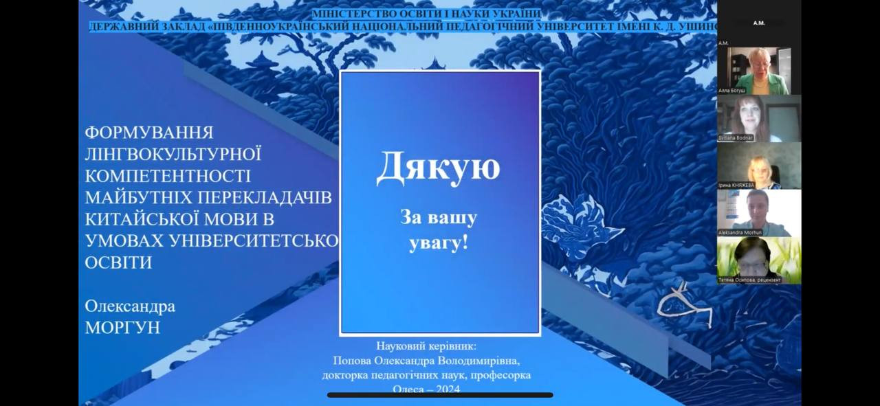 Вітаємо аспірантку Олександру МОРГУН та її наукового керівника проф. Олександру ПОПОВУ з успішним захистом дисертації на здобуття наукового ступеня доктора філософії зі спеціальності 011 Освітні, педагогічні науки» на тему «Формування лінгвокультурної компетентності майбутніх перекладачів китайської мови в умовах університетської освіти».