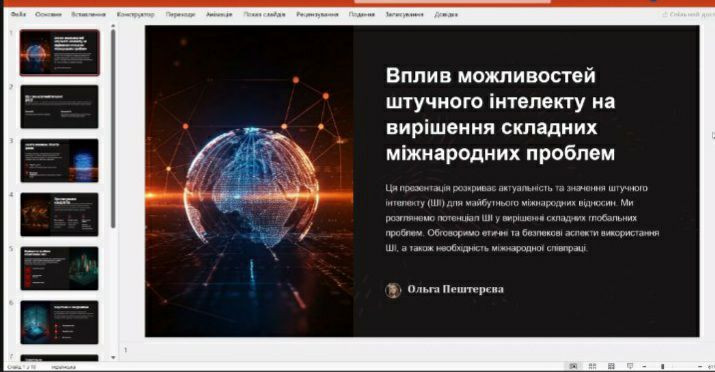 О. Пештєрєва розглянула потенціал ШІ у вирішенні складних глобальних проблем, пояснила етичні та безпекові аспекти використання ШІ. Наприклад, для прогнозування зон ризику виникнення конфліктів, адже ШІ може аналізувати соціально-економічні показники та політичну нестабільність, що дозволить завчасне втручання та зменшення негативних наслідків. ШІ здатен аналізувати дані для виявлення та прогнозування спалахів захворювань, розроблення ліків у боротьбі з пандеміями. Спрогнозувала майбутнє застосування ШІ у міжнародних відносинах та підкреслила необхідність розвитку міжнародних стандартів та угод щодо використання ШІ, міжнародної співпраці для розробки ШІ-рішень та відповідальний підхід до впровадження ШІ.