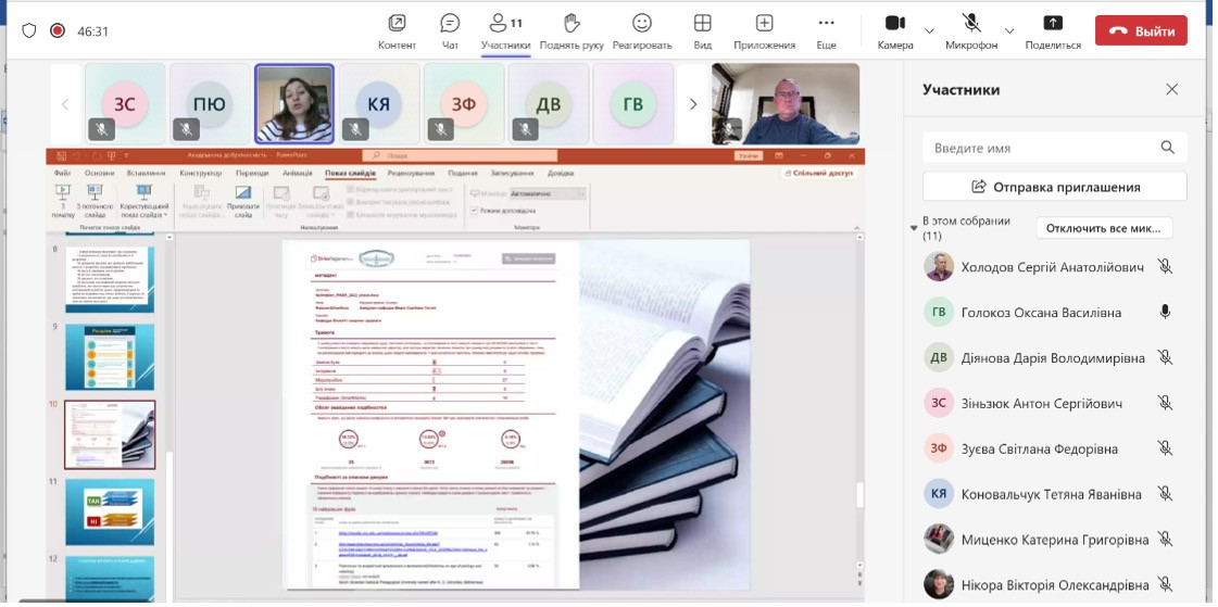 20 березня 2025 року в рамках тижня доброчесності для здобувачів другого (магістерського) рівня вищої освіти спеціальності 017 Фізична культура і спорт ОПП Адаптивна фізична культура проведено онлайн-вебінар за темою «Принципи академічної доброчесності в науковій діяльності».Завідувач кафедри фізичної реабілітації, біології і охорони здоров’я, кандидат біологічних наук, доцент Топчій Марія Сергіївна разом з гарантом освітньої програми кандидатом педагогічних наук, доцентом Холодовим Сергієм Анатолійовичем ознайомили здобувачів з принципами академічної доброчесності, правилами дотримання і відповідальності за її недотримання.
