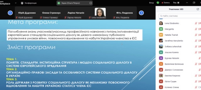 Учасники тренінгу мали можливість обговорити ключові аспекти соціального діалогу як дієвого інструменту публічного управління, особливо в складних умовах воєнного часу та майбутнього відновлення країни. Особливу увагу було приділено ролі соціального діалогу в процесі набуття Україною членства в Європейському Союзі.