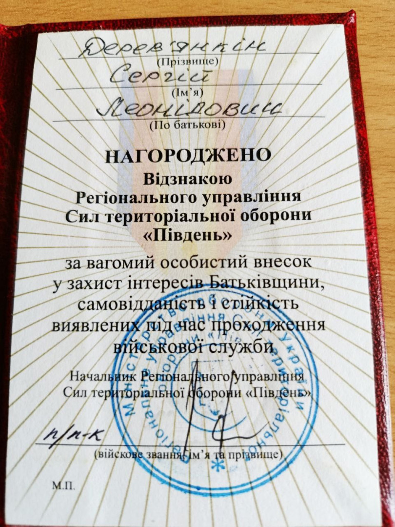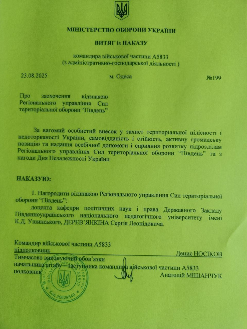 Доцента кафедри політичних наук і права Деревянкіна Сергія Леонідовича нагороджено відзнакою Регіонального управління Сил територіальної оборони "Південь" за вагомий внесок у захист територіальної цілісності і недоторканності України, самовідданість і стійкість, активну громадську позицію та надання всебічної допомоги та з нагоди Дня Незалежності України! Щиро вітаємо колегу з цією відзнакою!