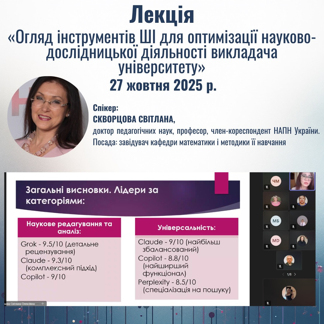 Під час лекції було представлено огляд сучасних інструментів штучного інтелекту, що допомагають викладачам підвищити ефективність науково-дослідницької роботи.