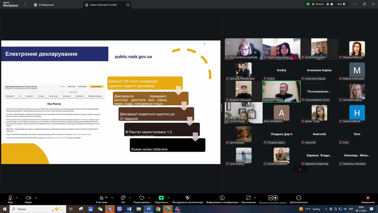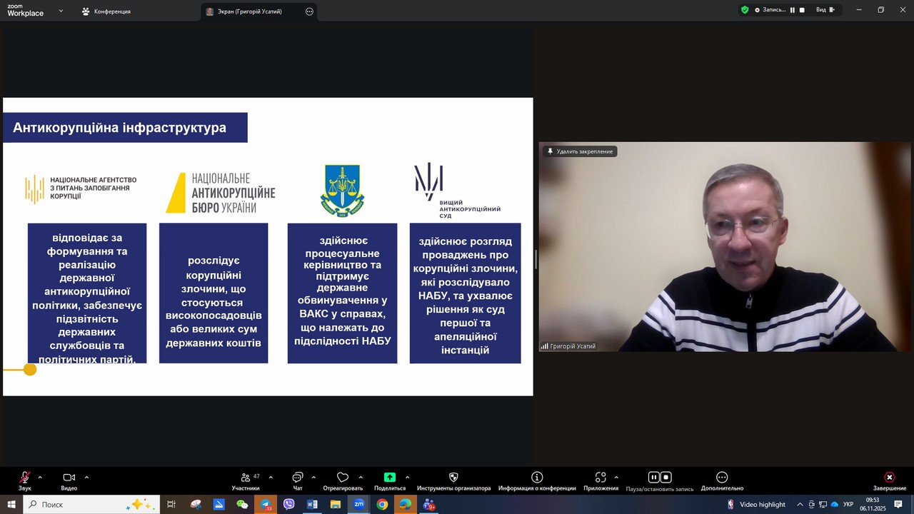 06 листопада 2025 року в Університеті Ушинського у межах вивчення навчальних дисциплін антикорупційного змісту («Запобігання та протидія корупції», «Антикорупція і доброчесність», «Державна політика», «Публічна влада та управління») відбулася відкрита гостьова лекція професіонала-практика, заступника керівника відділу реалізації політики у сфері правопорядку Управління реалізації антикорупційної політики у сферах економіки та правопорядку НАЗК, к.ю.н., доцента Григорія УСАТОГО на тему «ЗАПОБІГАННЯ КОРУПЦІЇ В УМОВАХ ВІЙНИ: НОВІ ДОСЯГНЕННЯ ТА ВИКЛИКИ».