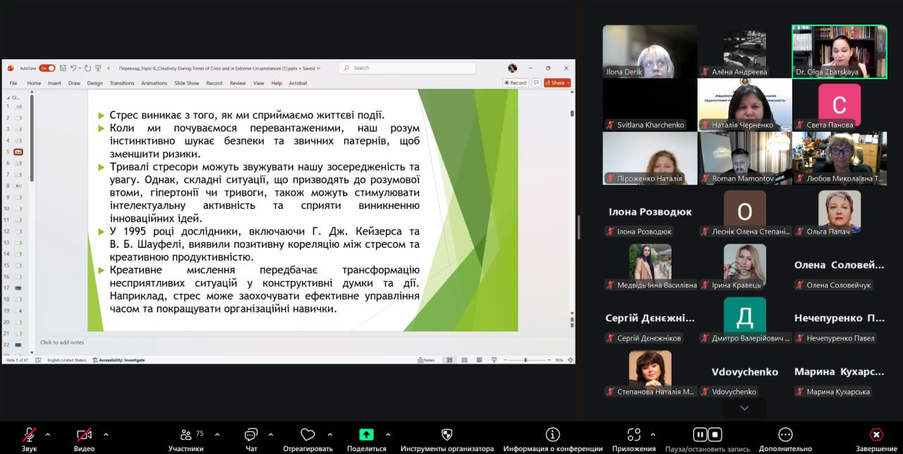 Під час лекції спікери розкрили значення креативності як рушійної сили особистісного й професійного розвитку в умовах нестабільності та криз, акцентували увагу на ролі освіти в розвитку креативного мислення керівників, педагогів і психологів.