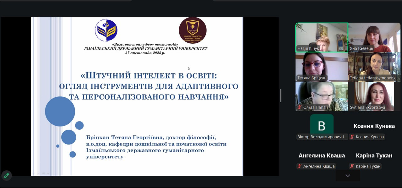 27 листопада 2025 року на базі Ізмаїльського державного гуманітарного університету пройшов "Ярмарок трансферу технологій" за участі викладачів кафедри математики і методики її навчання Університету Ушинського. Захід відбувся в межах україно-австрійського міжнародного проєкту “Використання інструментів штучного інтелекту у професійній діяльності викладача університету”, мета якого – представлення проміжних результатів дослідження.