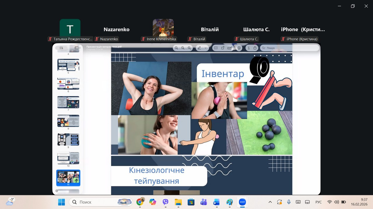 16 лютого 2026 року науковий керівник проблемної групи «Фізкультурно-спортивна реабілітація», д-р наук з фіз. виховання і спорту, доцент кафедри гімнастики та фізкультурно-спортивних технологій Буховець Божена та члени проблемної групи здобувачі другого (магістерського) рівня вищої освіти спеціальності А7 Фізична культура та спорт прийняли участь у науковій онлайн-платформі здобувачів вищої освіти кафедри кінезіології та фізкультурно-спортивної реабілітації Національного університету фізичного виховання і спорту України «Фізкультурно-спортивна реабілітація крізь призму сучасних дипломних досліджень».