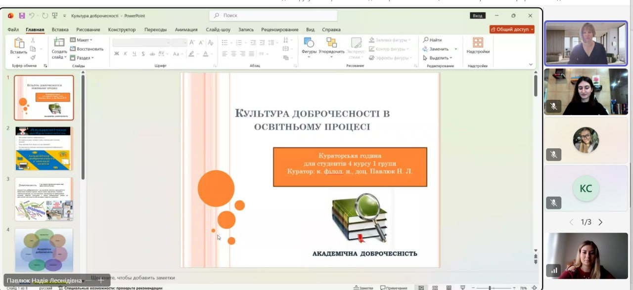 Метою кураторської години було формування у студентів усвідомленого ставлення до принципів академічної чесності, відповідальності та етичної поведінки в навчальному і науковому середовищі.