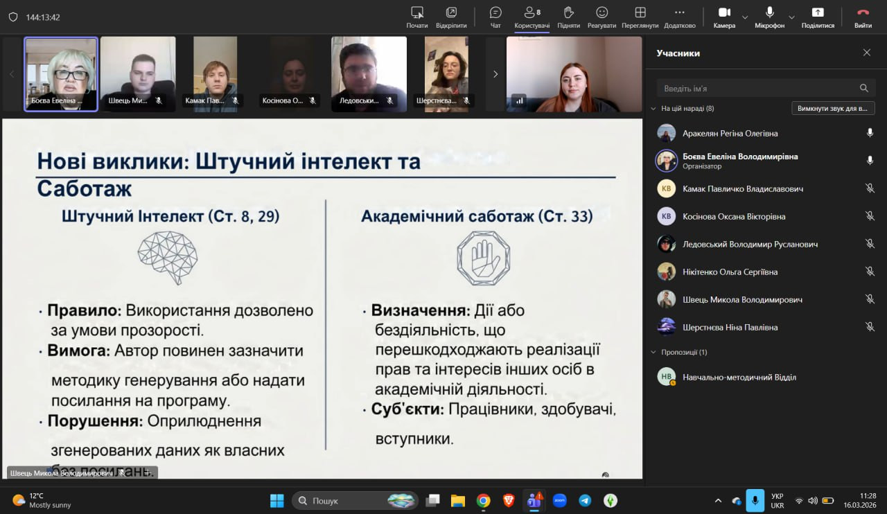 Під час заходу обговорювалися питання академічної доброчесності, правил цитування наукових джерел, уникнення плагіату та важливості самостійності під час написання магістерських робіт. Особливу увагу було приділено етичним нормам наукової діяльності та формуванню академічної культури молодих дослідників.