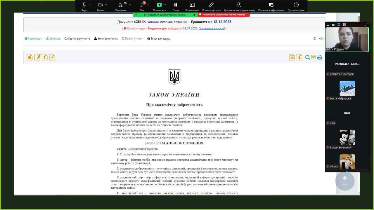 Також були розібрані проблеми плагіату, особливості коректного і некоректного використання Штучного Інтелекту в наукових дослідженнях, та основні виклики наукової етики щодо співавторів та респондентів.