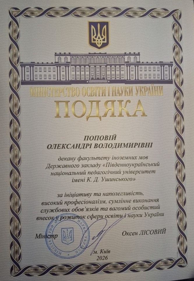 26 березня 2026 року на засіданні вченої ради Університету Ушинського ректор Андрій КРАСНОЖОН урочисто вручив декану факультету іноземних Олександрі ПОПОВІЙ Подяку від Міністерства Освіти і Науки України за ініціативу та наполегливість, високий професіоналізм, сумлінне виконання службових обов’язків та вагомий особистий внесок у розвиток сфери освіти і науки України! Подяку підписано Міністром Освіти і Науки України паном Оксеном ЛІСОВИМ.