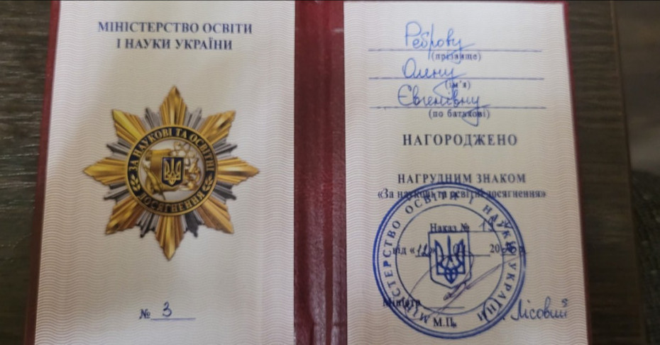 Олена Реброва разом з Нагрудним знаком отримала посвідчення про нагородження за підписом міністра освіти і науки України О.Лісового.