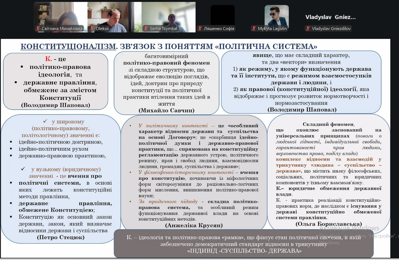 На лекції розглядалися питання аналізу політичних систем на основі інституційного, інформаційно-ентропійного, структурно-функціонального, комунікаційного, біхевіористського та інших методологічних підходів, а також методологія конструктивізму в дослідженні політичних систем і авторські підходи щодо визначення особливостей політичних систем, механізмів їх функціонування (Д. Істон) і критеріїв класифікації (К. Дойч). Особлива увага була приділена впливу правової традиції та правових сімей на загальний розвиток конституціоналізму, а відтак і на конструювання політичних систем, стан їх функціонування і динаміку розвитку. Окремо лектор зупинився на етапах розвитку конституціоналізму в державах з різними політичними системами, зокрема на історії походження й класифікації конституцій, конституційно-правових відносинах, об’єктах конституційного регулювання, змісті конституцій окремих держав, а також на основі запропонованої класифікації конституційних актів за визначеними критеріями розкрито характер відносин у політичних системах.