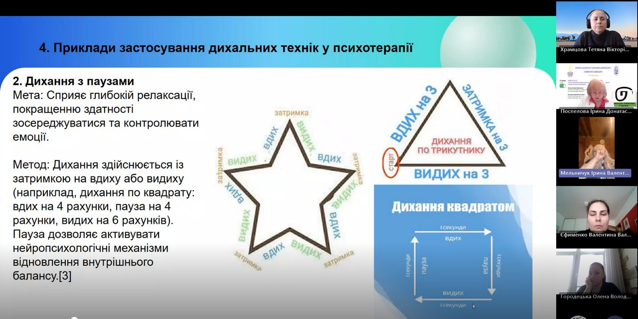 Цікавість викликали практичні вправи: діафрагмальне дихання; дихання з паузами; чергування носового дихання; дихання «Ха»; глибоке дихання за допомогою звуків (із гудінням) тощо.