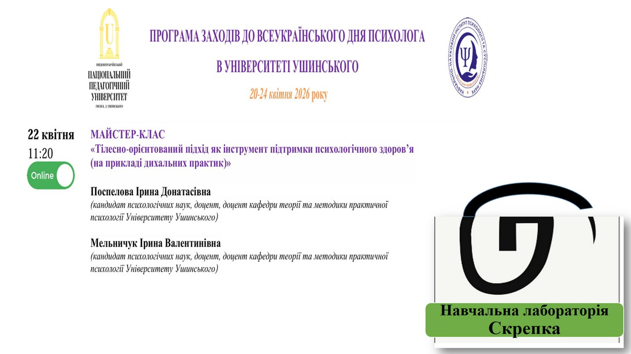 22 квітня доценти кафедри теорії та методики практичної психології Мельничук Ірина Валентинівна та Поспелова Ірина Донатасівна провели онлайн-майстер-клас на тему «Тілесно-орієнтований підхід як інструмент підтримки психологічного здоров’я (на прикладі дихальних практик)» на базі платформи навчальної лабораторії «СКРЕПКА», що присвячений Всеукраїнському дню психолога.