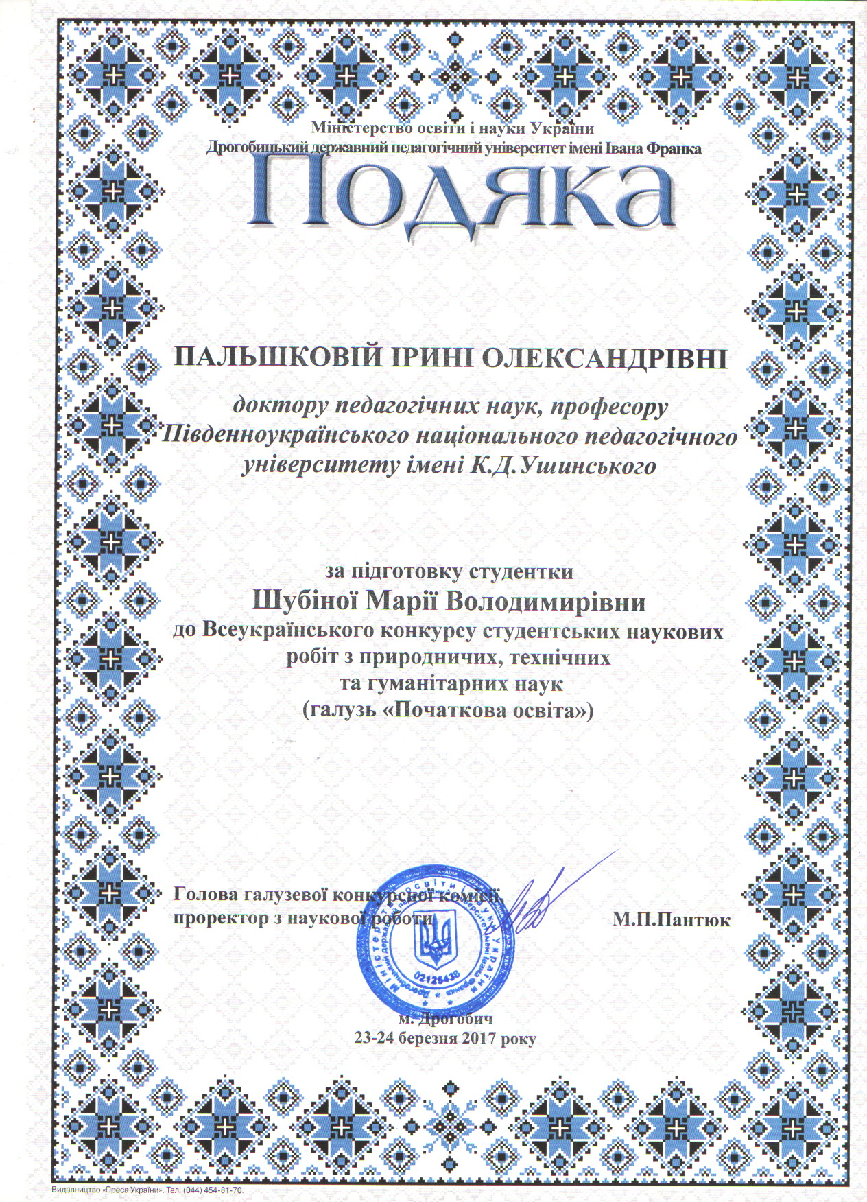 За результатами Конкурсу студентка V курсу факультету початкового навчання ПНПУ імені К.Д. Ушинського Шубіна Марія посіла ІІ місце.