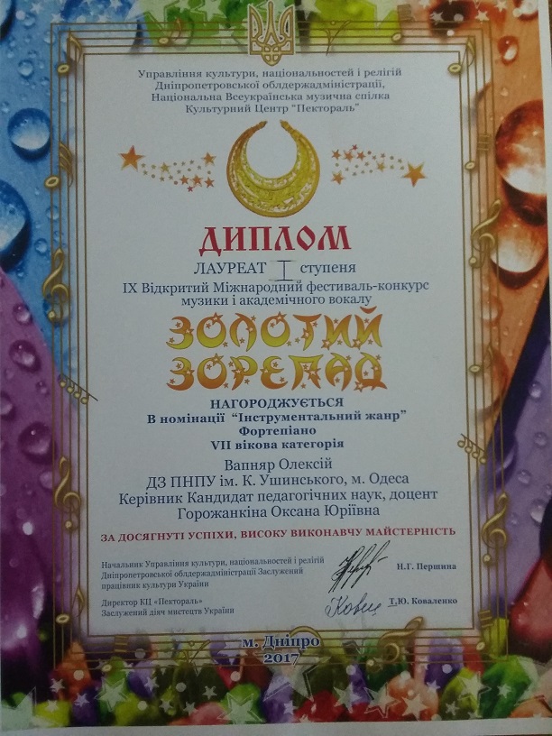 У IX Відкритому Міжнародному фестивалі-конкурсі музики «Золотий зорепад» ( м.Дніпропетровськ) звання лауреата І ступеню в номінації «Фортепіано» одержав магістрант факультету музичної та хореографічної освіти Олексій Вапняр (клас доцента Горожанкіної О.Ю.). Переможцями в номінації «Духові та ударні інструменти» стали студенти факультету музичної та хореографічної освіти - ансамбль ударних інструментів під керівництвом кандидата мистецтвознавства Рало Г.О., який також посів І місце у Міжнародному фестивалі-конкурсі «Одеса зустрічає друзів».
