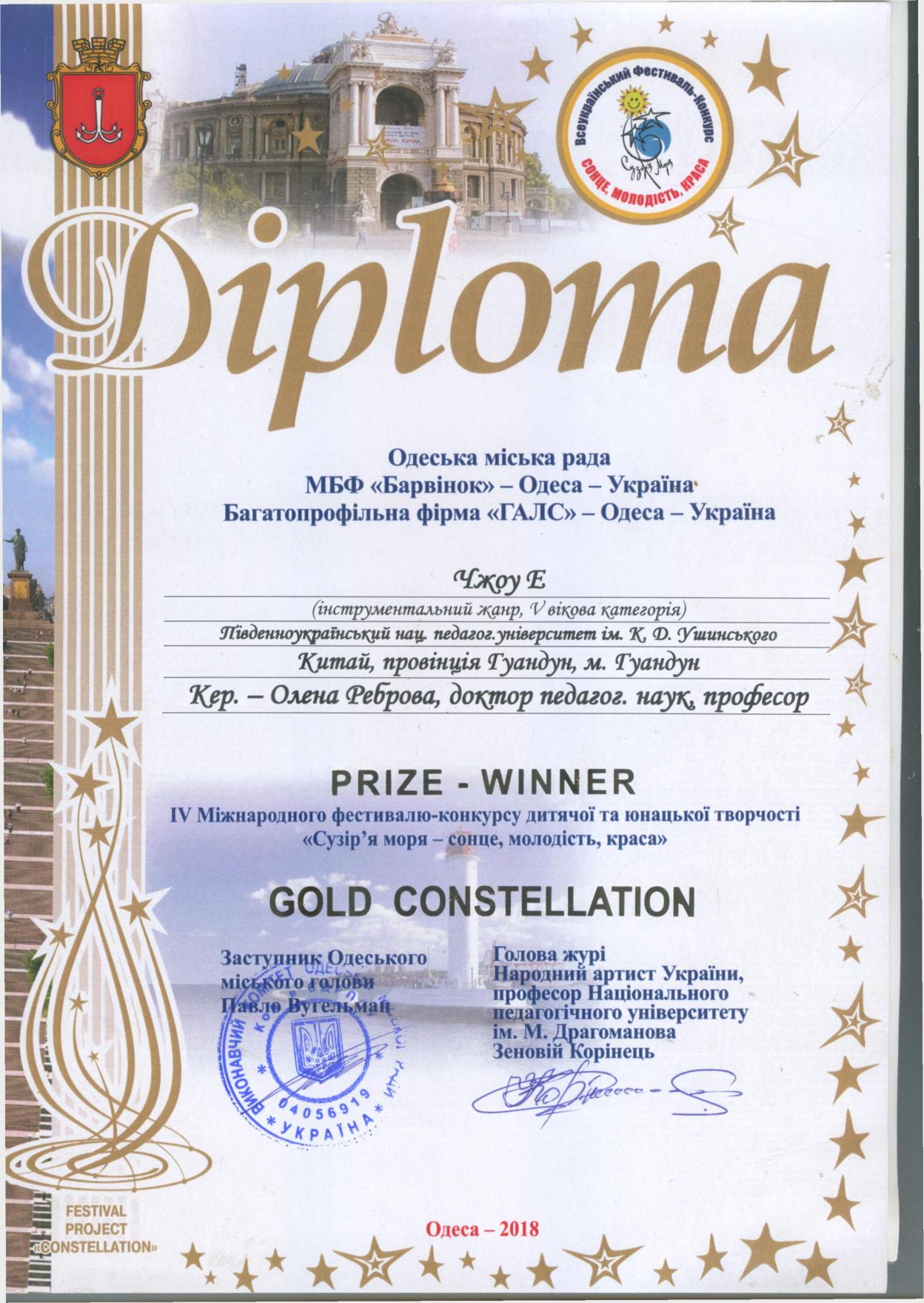 Студенти Університету Ушинського факультету музичної та хореографічної освіти Лі Ятін, ансамбль танцю «Орхестра», аспірантки кафедри музичного мистецтва і хореографії освіти Лай Сяоцянь та Чжоу Є. яскраво виступили на ІV Міжнародному фестивалі-конкурсі «Сузір’я моря – сонце, молодість, краса», що проводився в Одесі з 15.06.2018 по 17.06.2018. Цей конкурс традиційно проводиться у рамках Міжнародного фестивального проекту «Сузір’я» під патронатом, мерії Будапешта, мерії Пірана (Словенія), мерії Ліптовського Мікуліша (Словаччина), Національної академії мистецтв України, Міністерства освіти і науки України, Одеської міської ради.